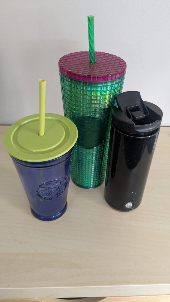 All have been used still all work fine. blue with straw is glassware green tall is plastic black short is a coffee thermal flask