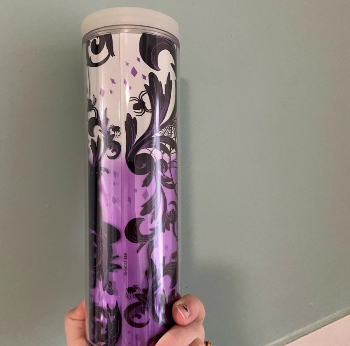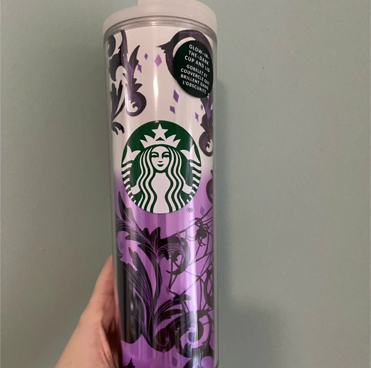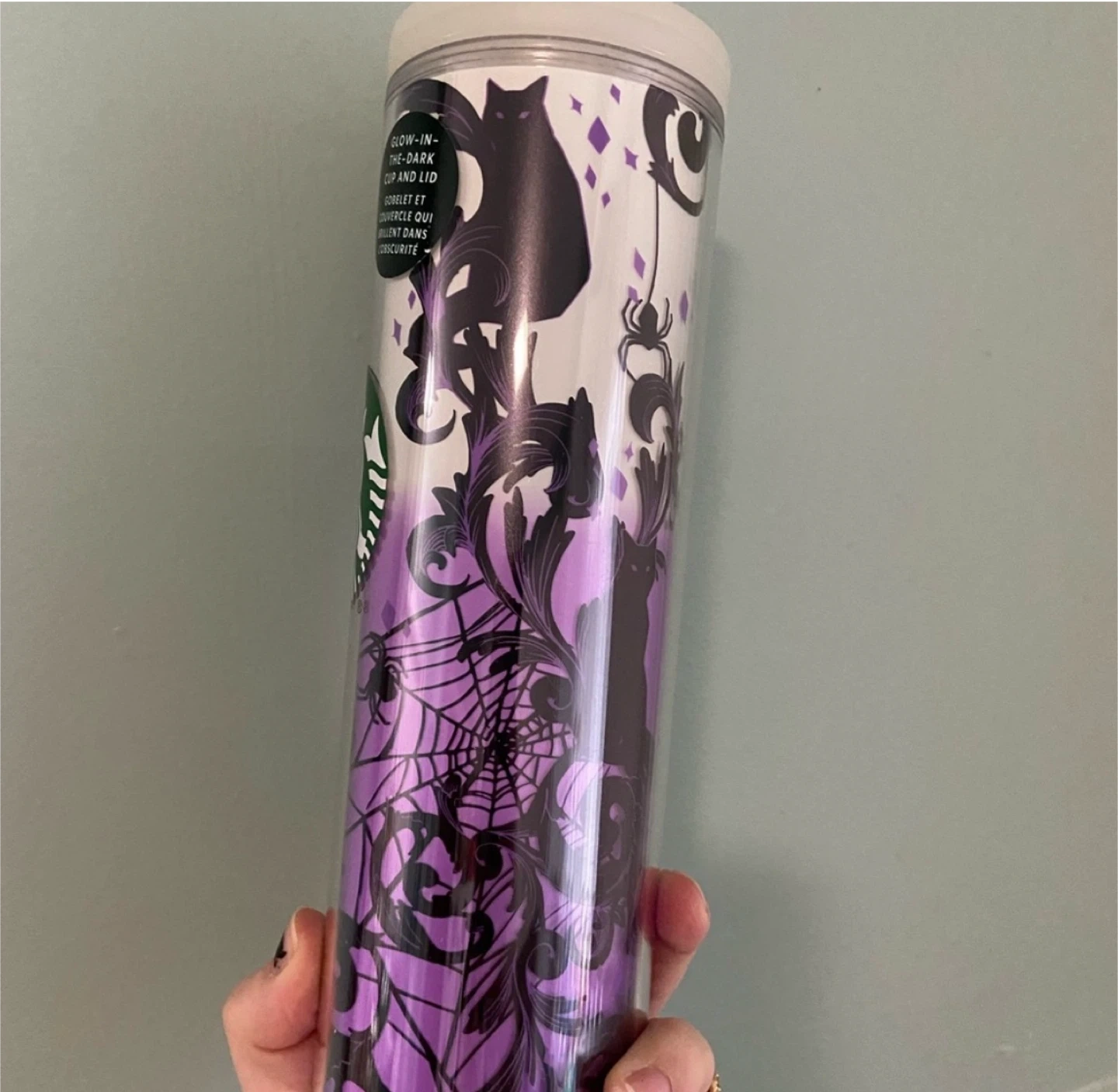 Selling a Starbucks Halloween-themed tumbler! It features a glow-in-the-dark cup and lid. The design has black cats, spiders and purple accents, perfect for spooky season Pickup at Renforth and Eglinton in Etobicoke, or tracked shipping available at buyers expense. Brand new never used, still has all original tags/labels/care instructions. Glows in the dark! 16oz / 473mL capacity. Can be used for either hot or cold drinks. Collectors item.