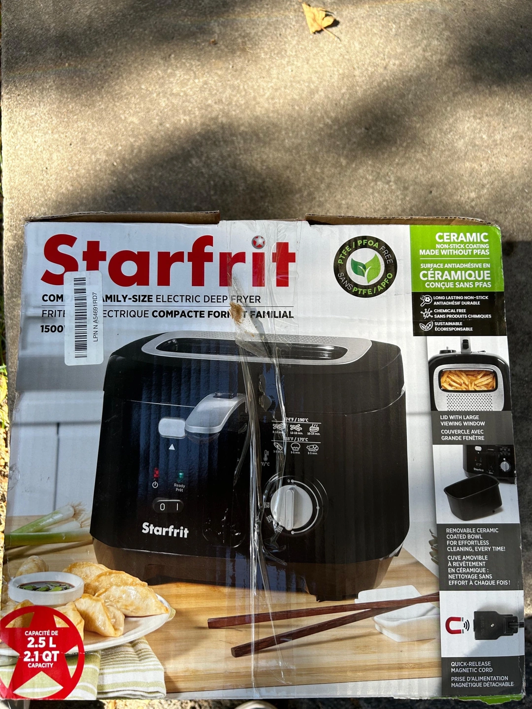 Cook crispy fries, chicken, and more right at home with this easy-to-use Starfrit Electric Deep Fryer. Designed for family use, it offers a generous 2.5 L (2.1 QT) capacity while staying compact enough to fit on your counter. Key Features: Ceramic non-stick coating – PTFE & PFOA free, safe and durable 1500W power for fast heating and frying 2.5L capacity – perfect for small families Removable ceramic-coated bowl for effortless cleaning Quick-release magnetic cord for safety Lid with large viewing window to monitor food as it cooks Condition: (Brand New in Box / Open Box / Gently Used – you can specify) Includes: Fryer unit, removable bowl, magnetic cord, lid with window Original price - 75 + tax Perfect for anyone who loves homemade fried food – safe, compact, and easy to clean!