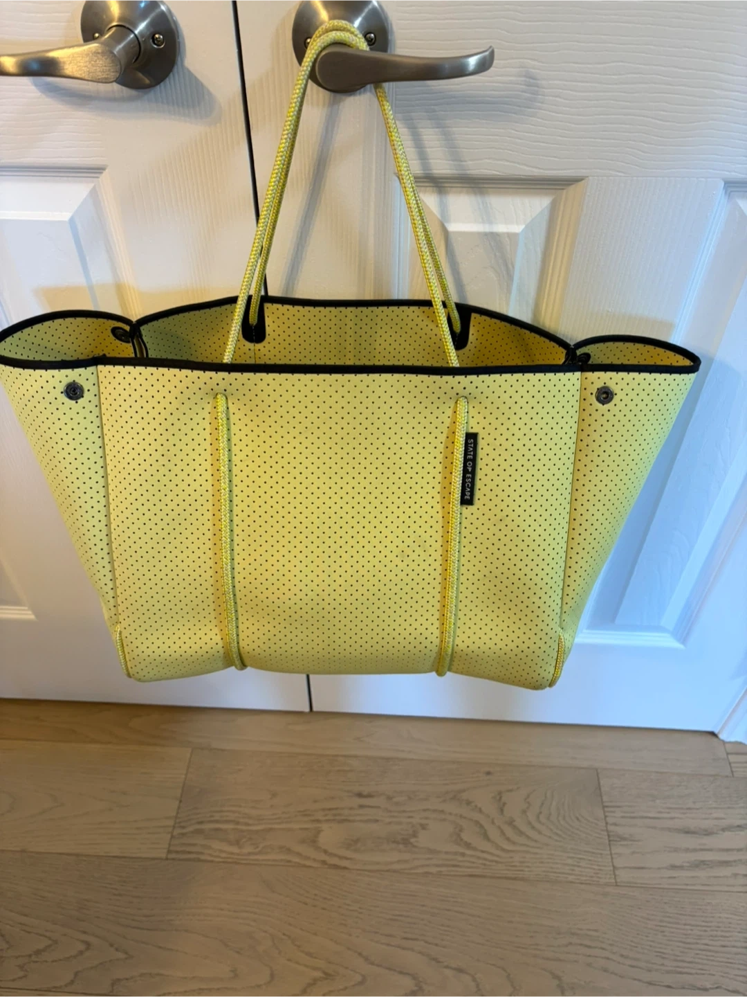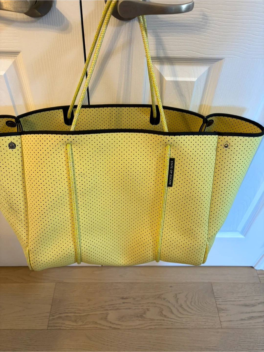 Looking to sell my State of Escape tote bag in a vibrant yellow! It's made of neoprene, making it super lightweight and durable. Perfect for everyday use or a day at the beach. It's in great condition and ready for a new home!