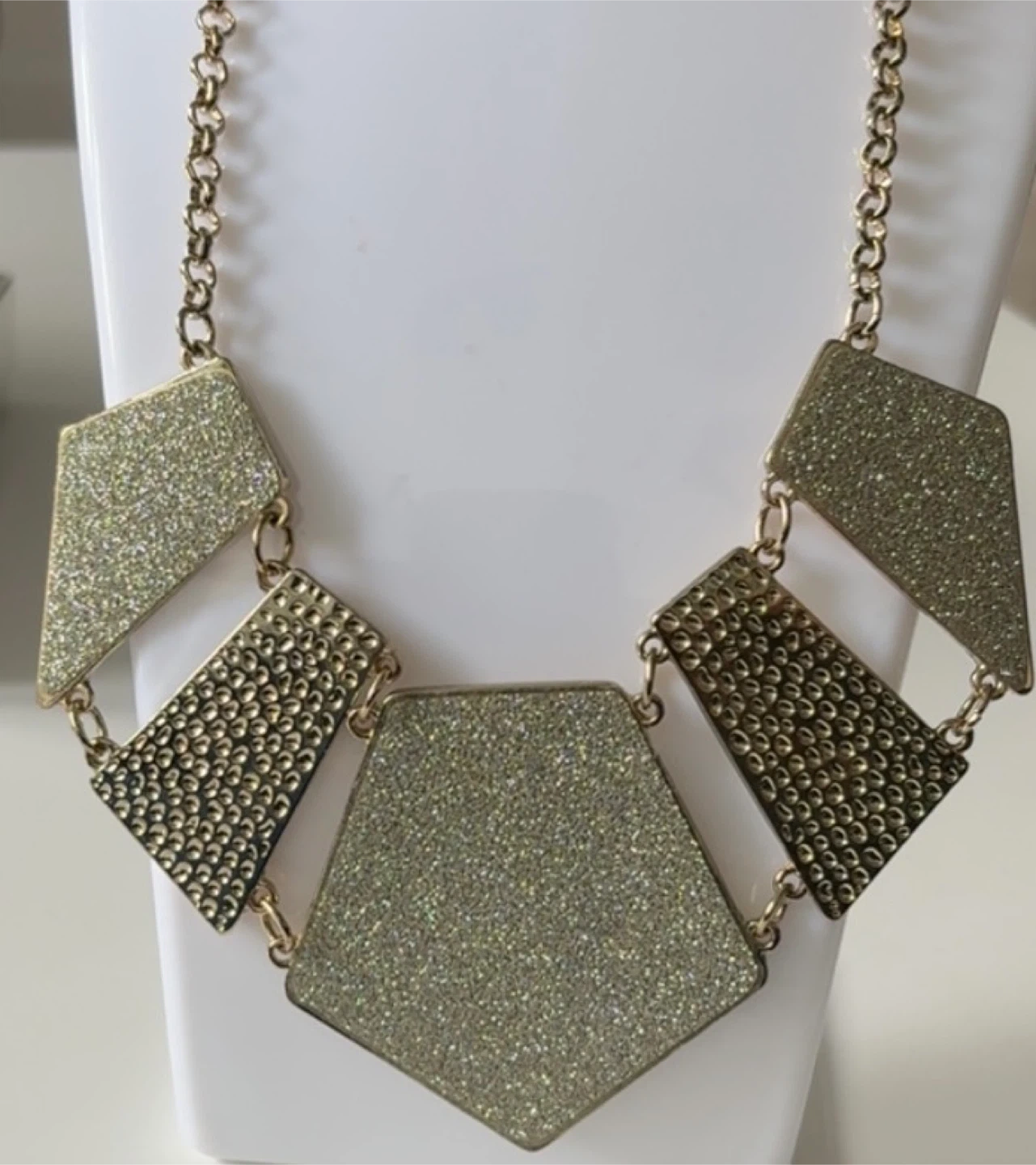 Gorgeous gold-tone statement necklace with geometric shapes! Perfect for dressing up any outfit.