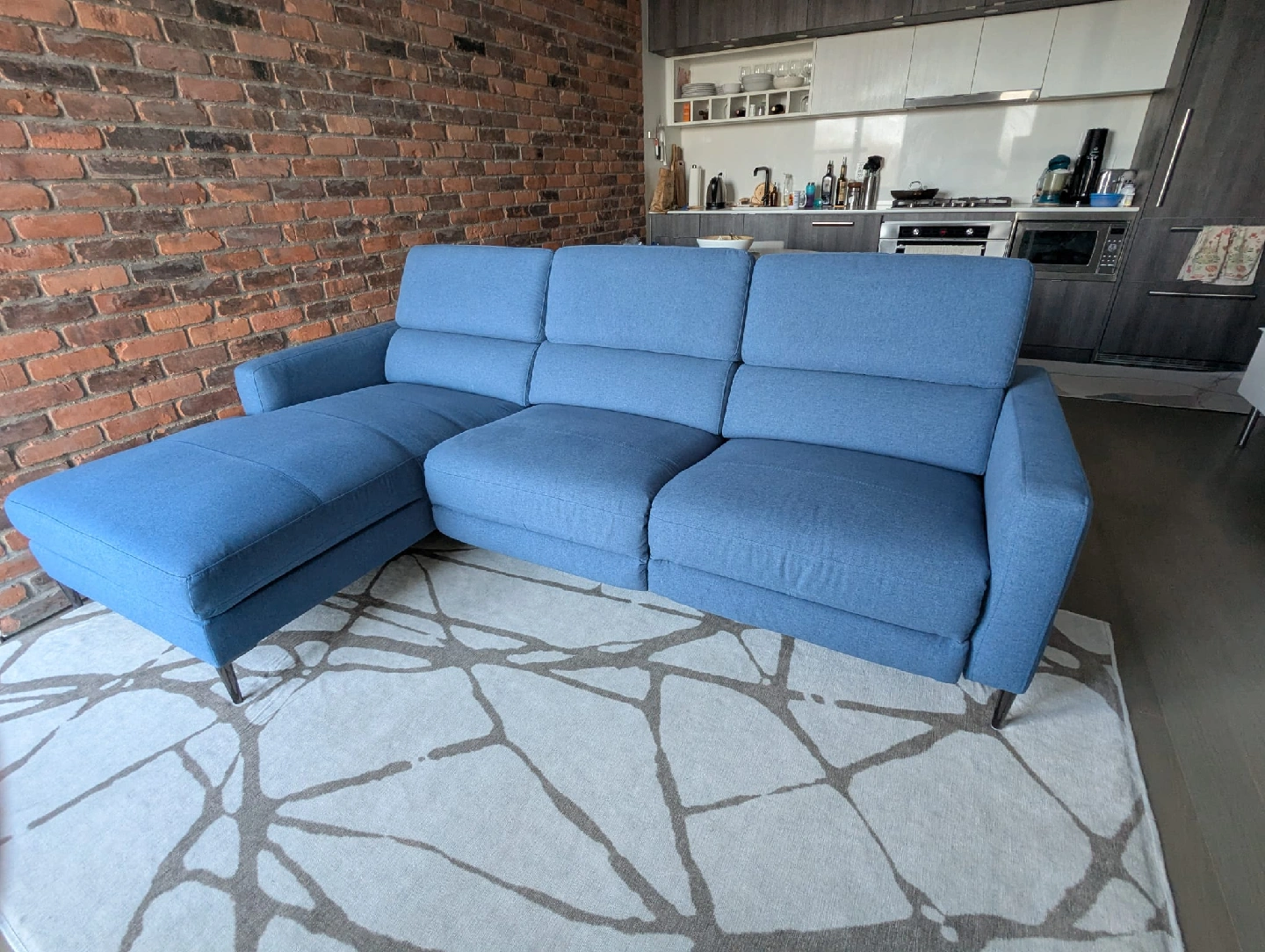 Selling this Mobilia statement blue sectional. This is a superior sofa with a recliner as well as reclining head rests. It's in great (like new) condition and can be disassembled into 2 parts for easier transportation. Retails for around $5,000. Must be able to pick up at 200 Fairbank Ave.