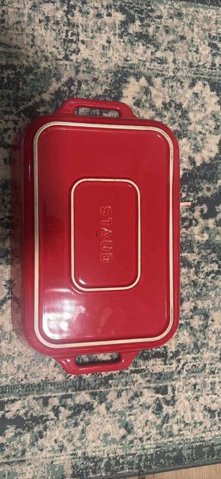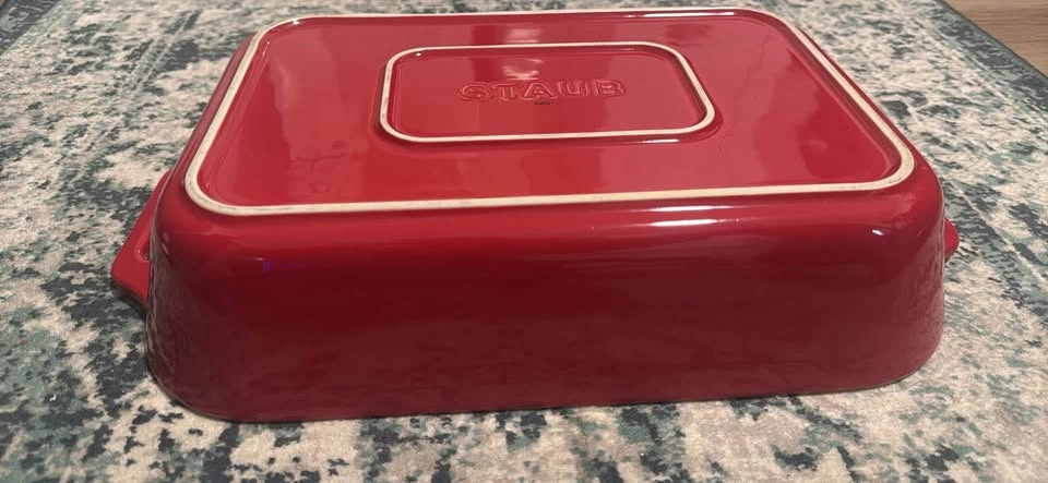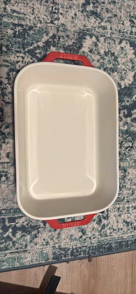Staub rectangular ceramic baking dish in excellent condition. Perfect for roasting, baking, and serving. Made with Staub’s high-quality ceramic that ensures even cooking and easy cleaning. Classic white interior with vibrant red handles for an elegant touch on the table. Dimensions: Approx. 13” x 9” (33 x 23 cm) Condition: Gently used, no cracks or chips Pick up Kingsway & 16th Ave(Burnaby)