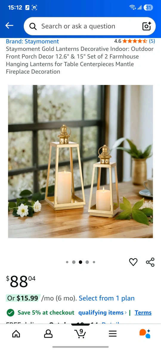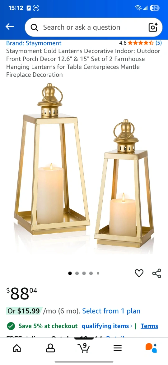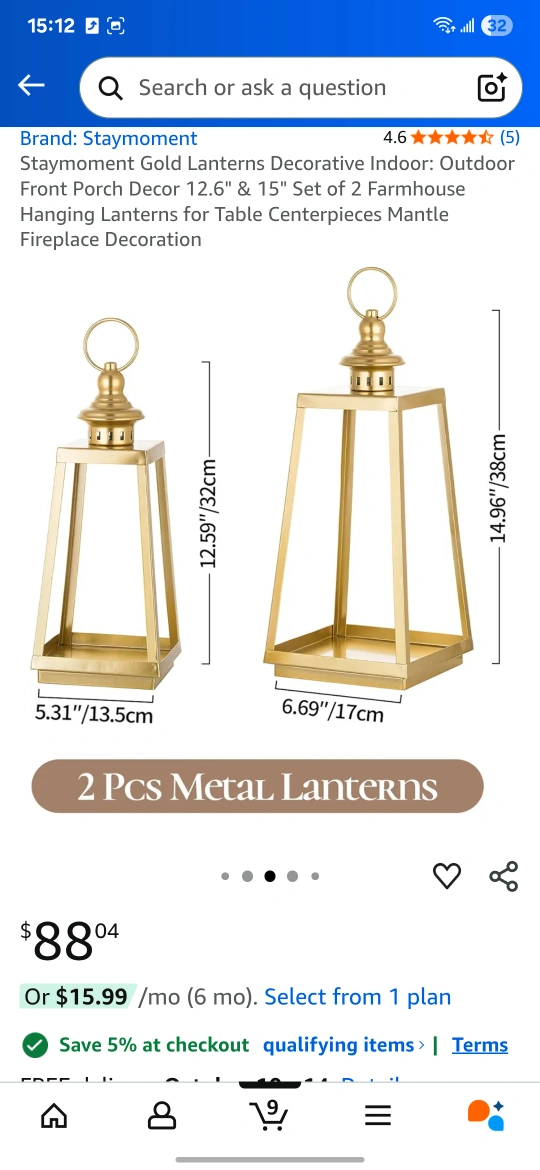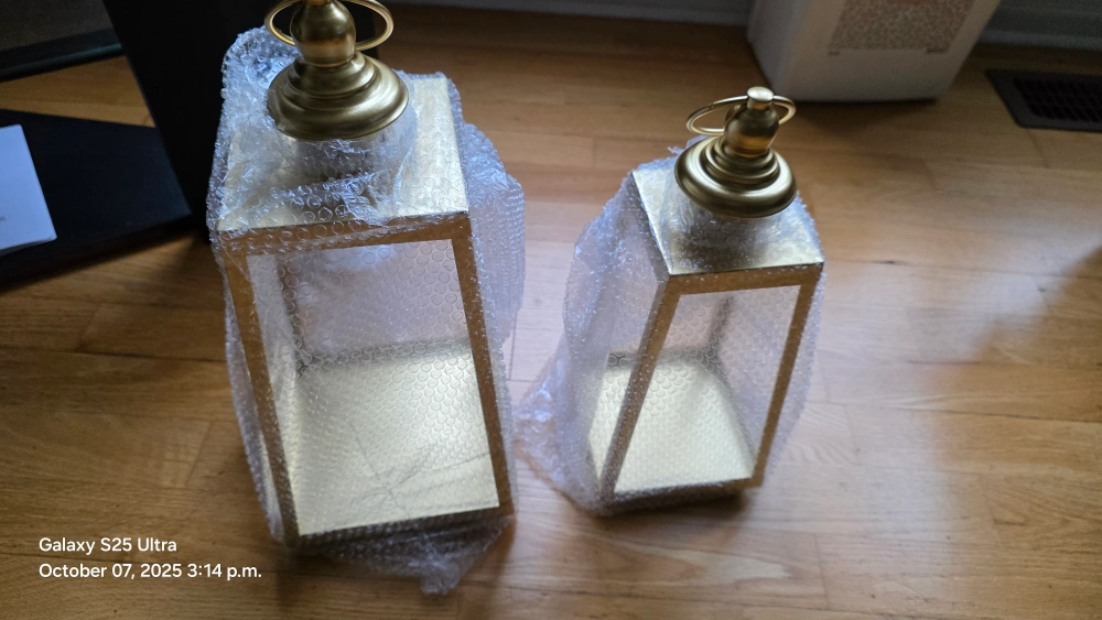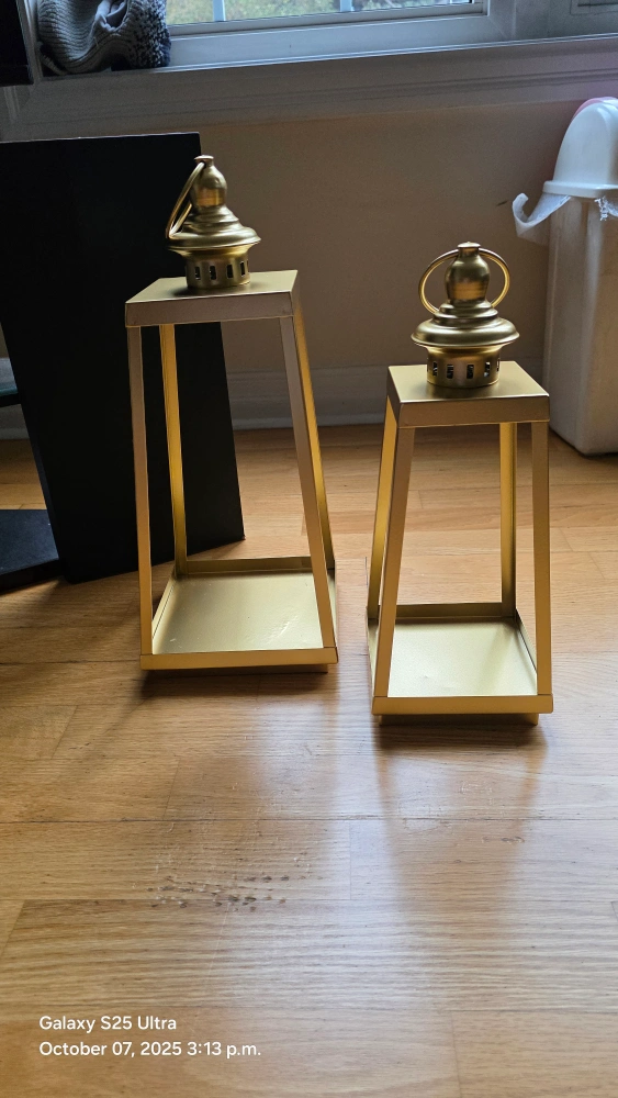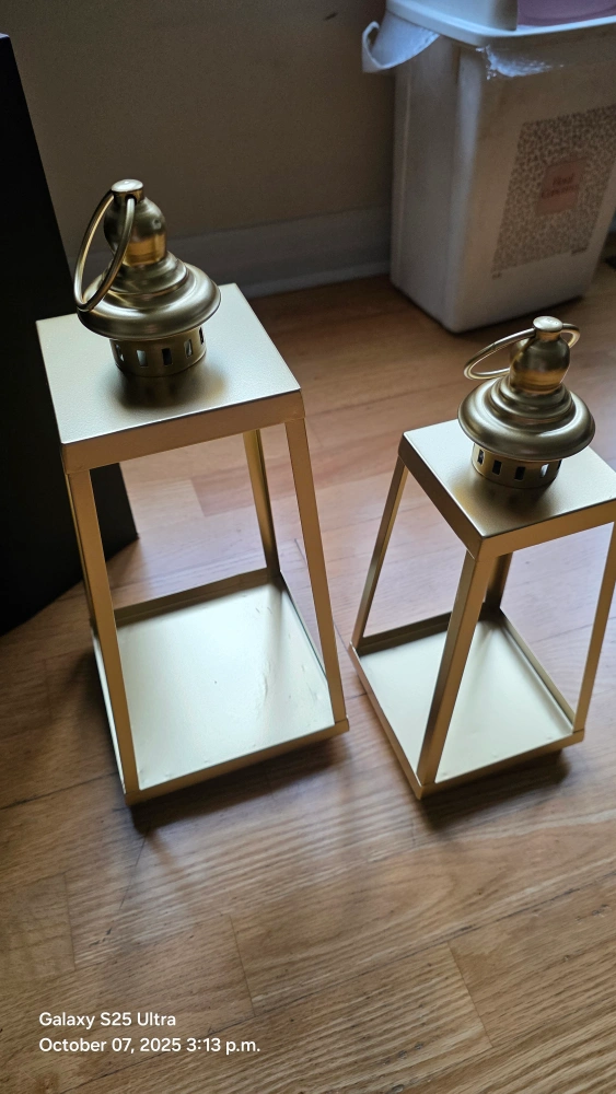 Selling a set of two gold lanterns by Staymoment. These lanterns are great for indoor or outdoor use, adding a touch of farmhouse charm to your space. The larger lantern is approximately 15 inches tall, while the smaller one is about 12.6 inches tall. They're perfect for table centerpieces or mantel decorations!