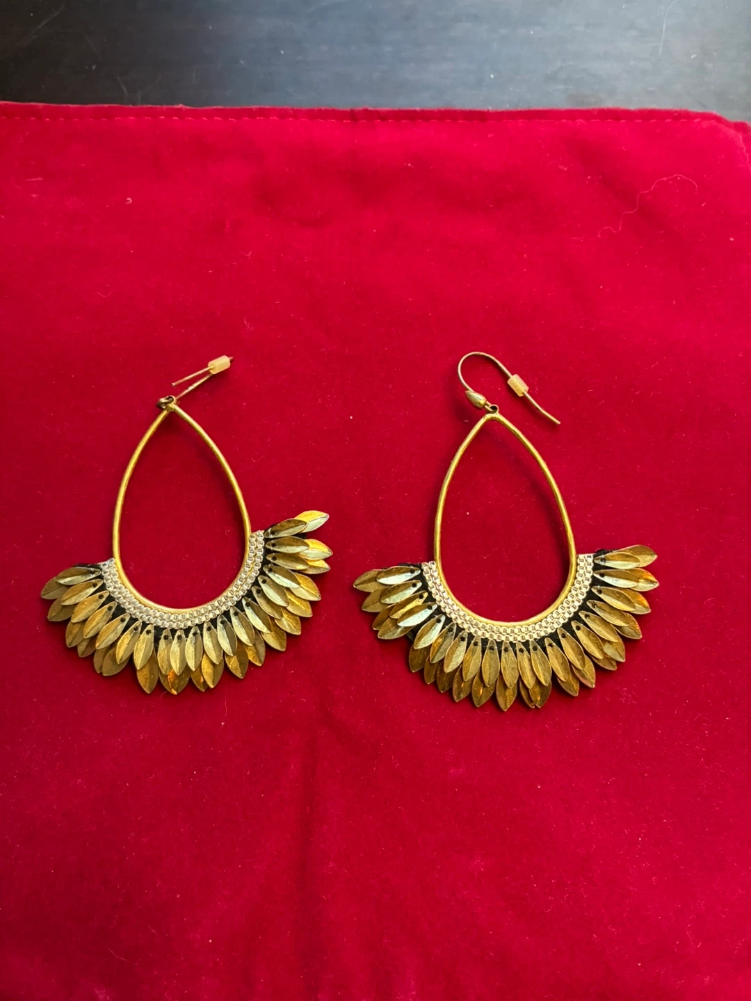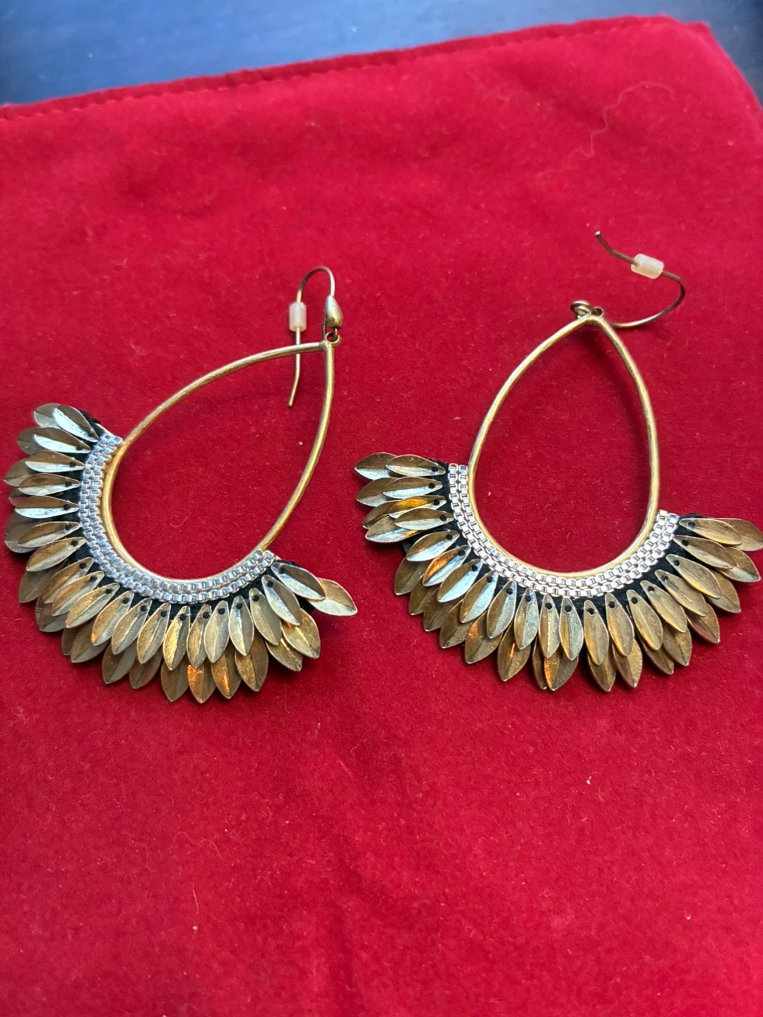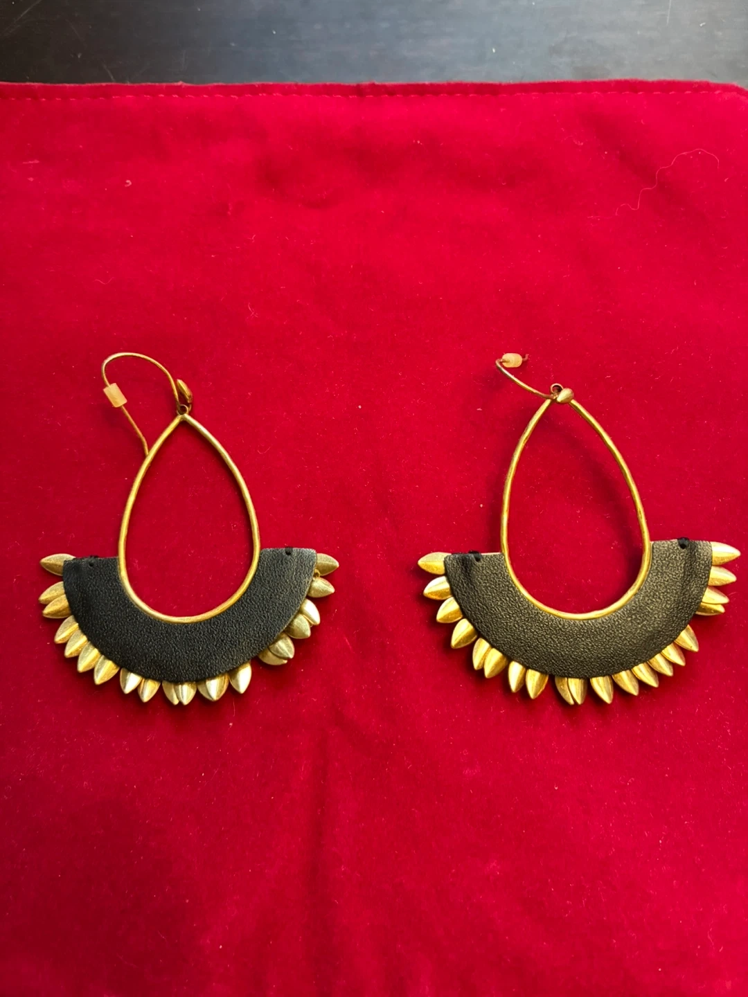 Stella and Dot Pegasus earrings. A pair of statement earrings. They feature a teardrop shape with gold-tone hardware and a black and gold embellishment and leather like backing. Excellent used condition.
