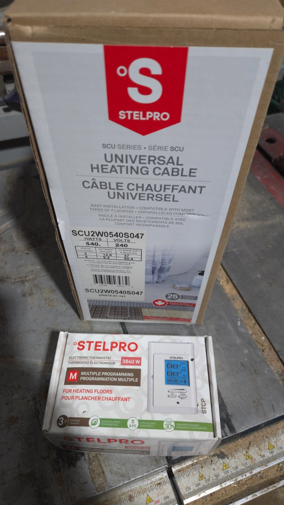Selling a Stelpro universal heating cable and electronic thermostat for heating floors. It features multiple programming options. Perfect for easy installation and compatible with most types of floors! Box included