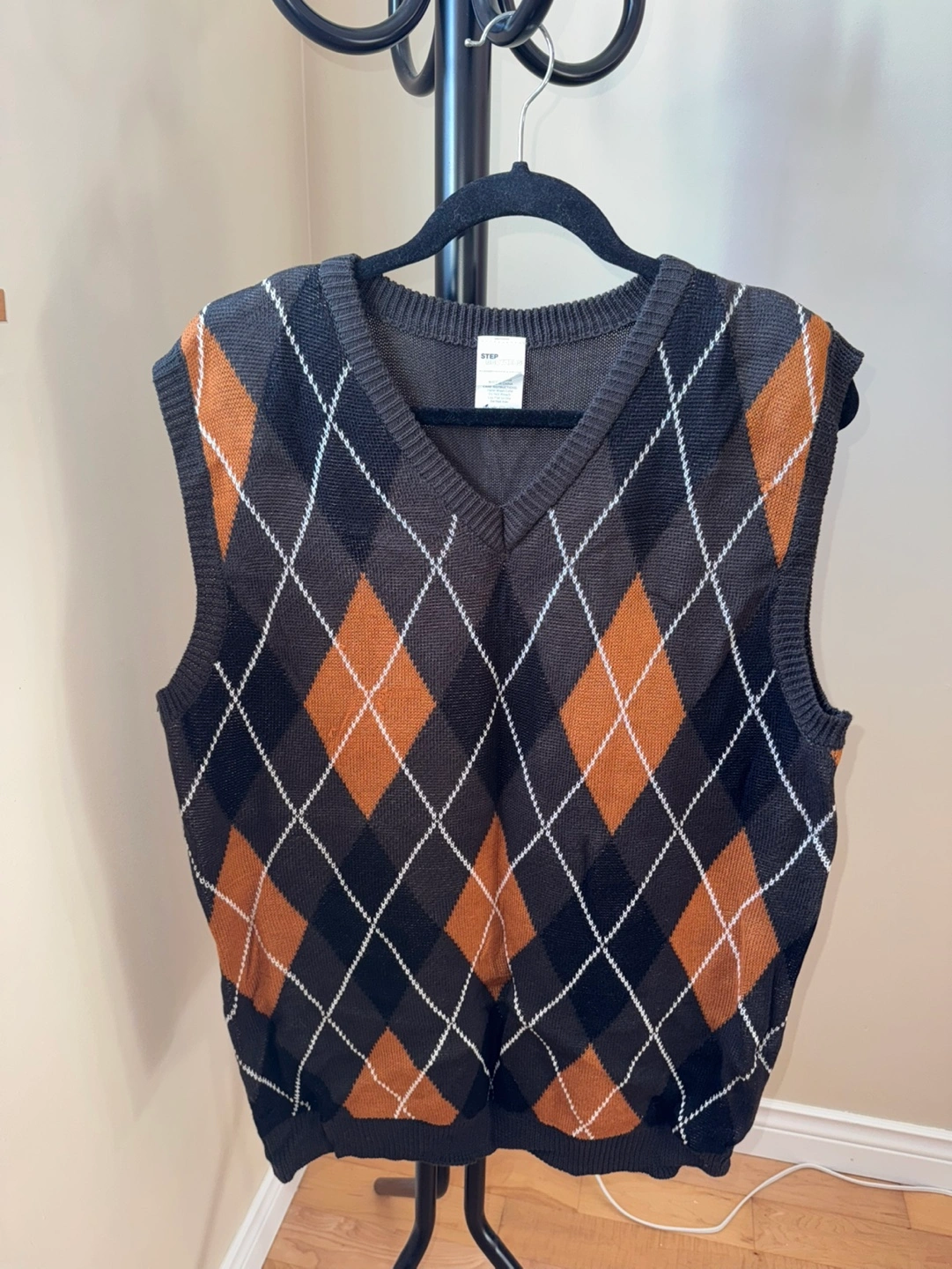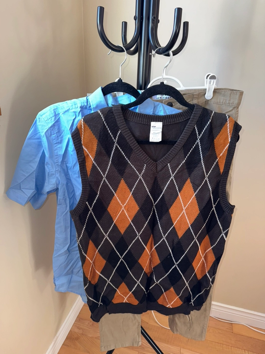 In like-new condition! Only worn for one day. Willing to sell the sweater vest by itself for $20 *From a smoke-free home* Sweater Vest is from Spirit Halloween (One Size fits all) Pants are from Urban Planet (Men's Size 34) Shirt is from Walmart (Men's Size Small)