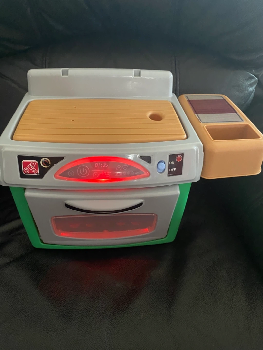 🥕🥕 Step2 small real working light and sound oven. Is battery operated when you turn it on a red light glows and makes a ding sound when done . Hours of fun for your toddler.. it is portable, light, can go on a table, highchair in a playpen, etc