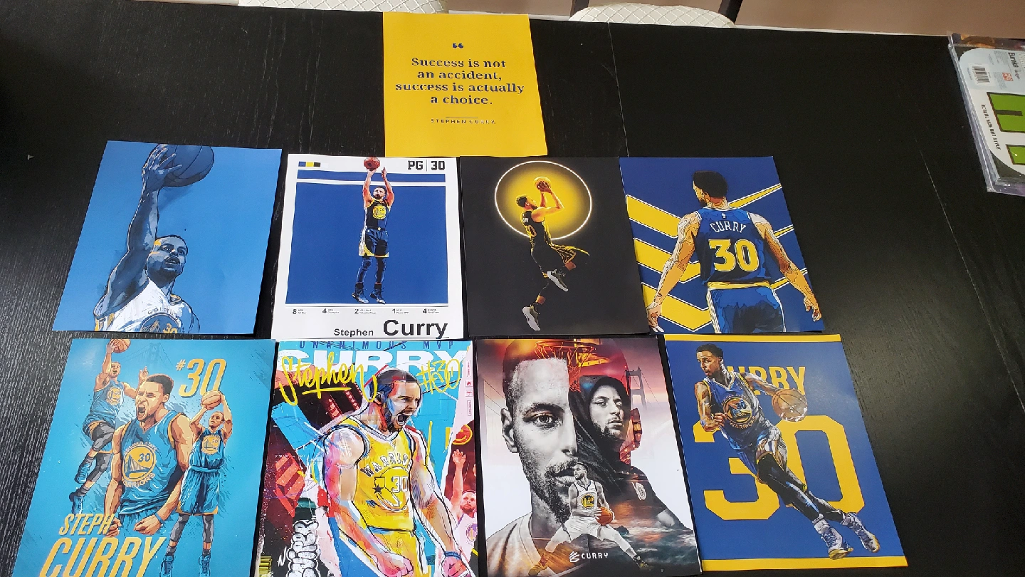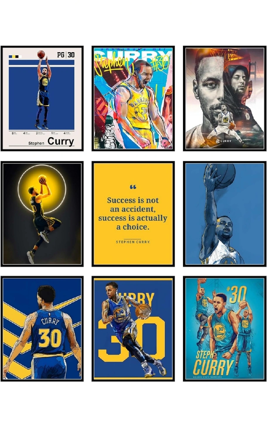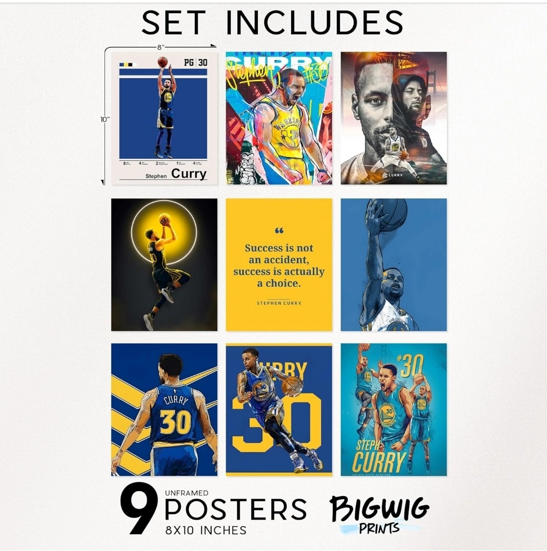 Steph Curry Poster Collection: This set of 9 (8x10") unframed Steph Curry posters captures the NBA icon in full flight. Featuring a variety of poses and plays, these vibrant prints are perfect for adding a touch of basketball magic to any fan's room, showcasing Curry's incredible athleticism and on-court skills.