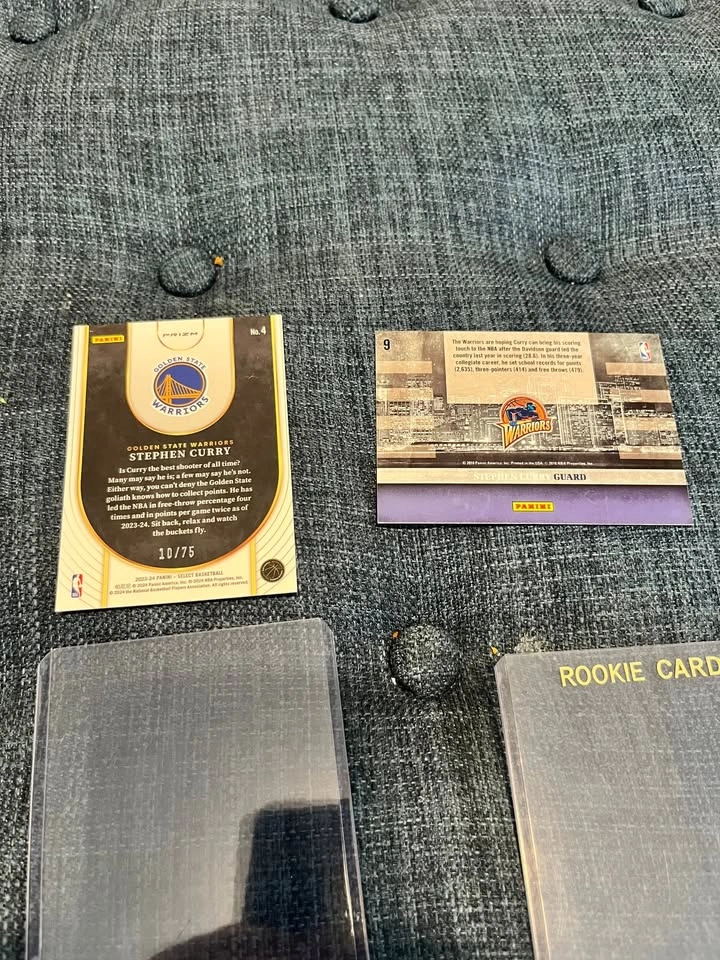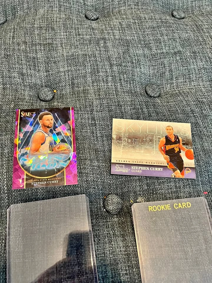 Selling a two-card lot of Stephen Curry cards. This is a must-have for any basketball card collector or Stephen Curry fan. This lot includes: 2023-24 Panini Select "Pink Prizm" Parallel: This is a very rare and highly desirable card. It is a limited edition parallel, numbered 10 out of only 75 copies produced worldwide. It's a beautiful card with a vibrant, refractive finish. 2019 Panini Studios "Skylines" Insert: A great-looking card from the 2019 Studios set with a unique city skyline design in the background. Both cards have been well-preserved in protective sleeves since they were pulled. They are in excellent condition and are ready for a new collection. Local pickup is preferred in Pickering.