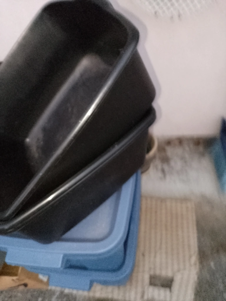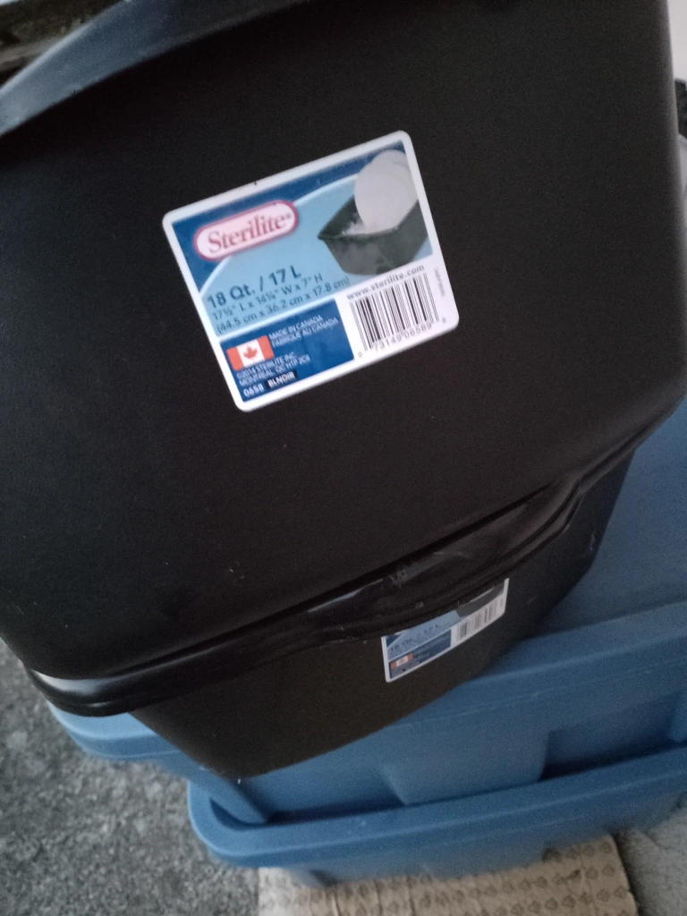 Selling a set of three Sterilite black storage totes. Each tote has a capacity of 18 quarts (17 liters). They measure approximately 14.5" L x 11.75" W x 7" H (36.8 cm x 29.8 cm x 17.8 cm). Great for organizing your stuff!