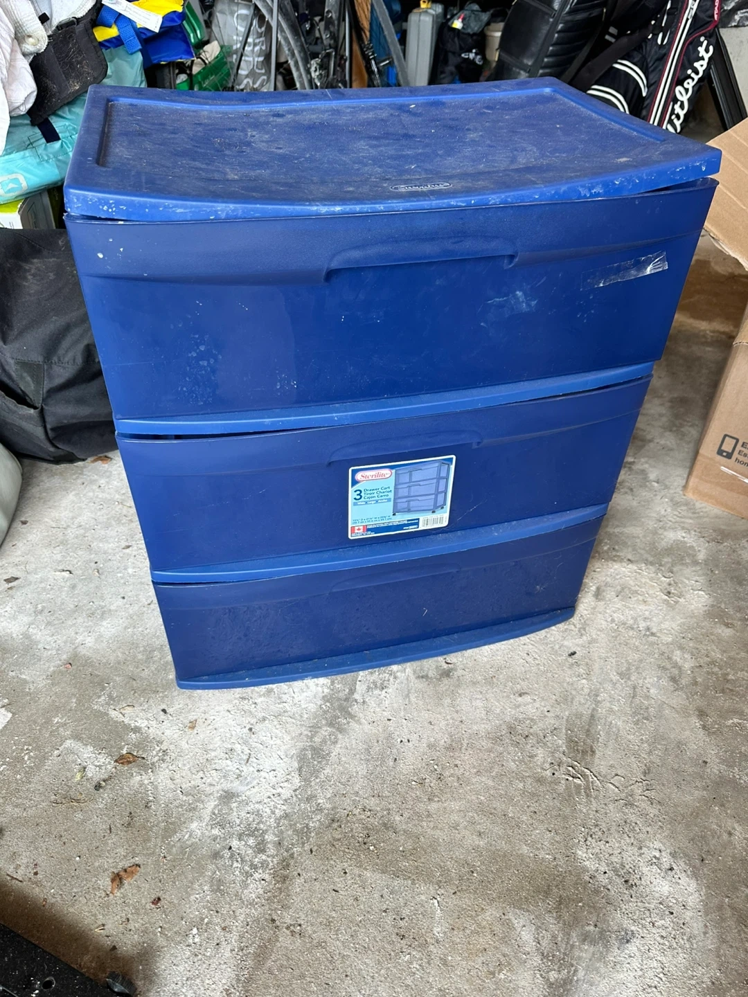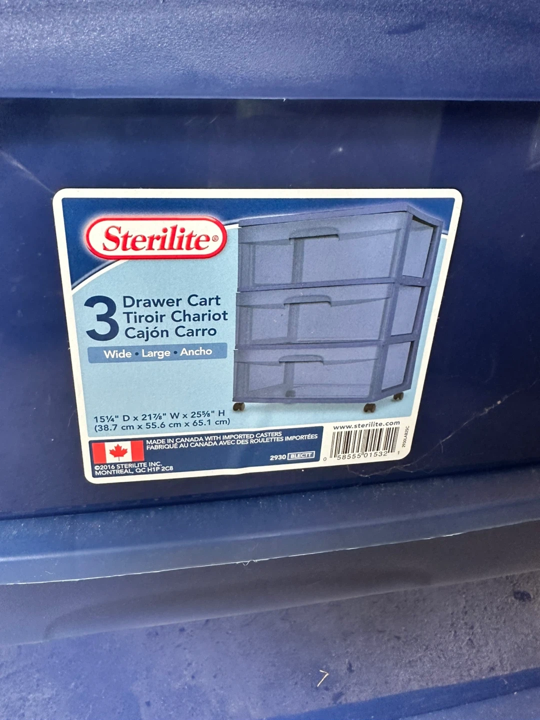 Selling a blue Sterilite 3 Drawer Cart! It's wide and large, perfect for storage. Comes with caster wheels. Dimensions are 15 1/4" D x 21 7/8" W x 25 5/8" H (38.7 cm x 55.6 cm x 65.1 cm)