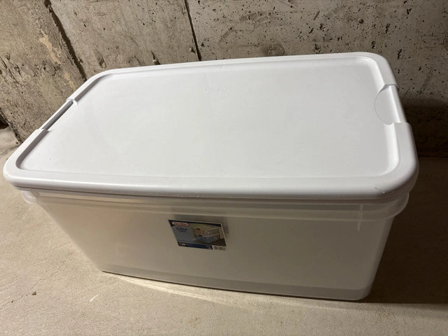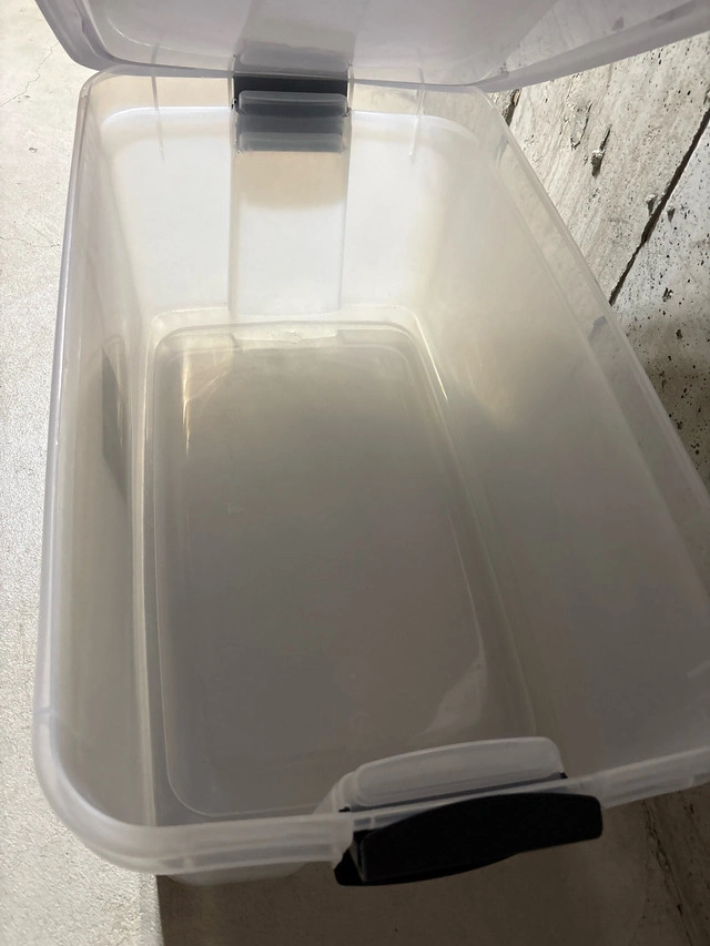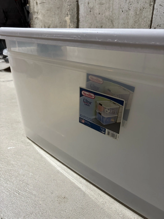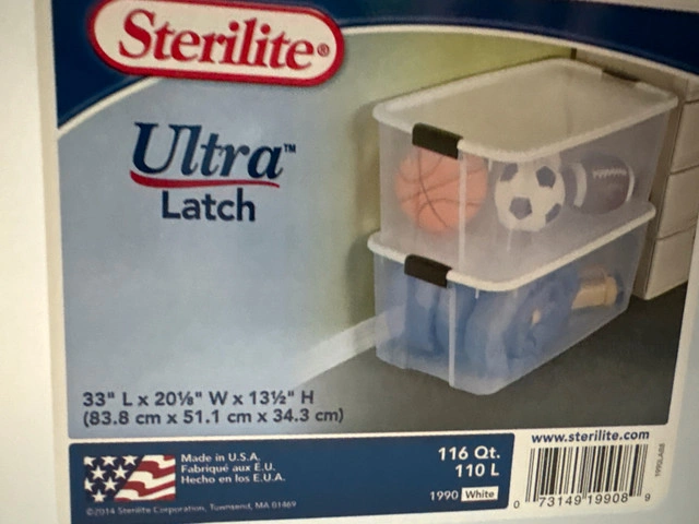 I'm selling a Sterilite Ultra Latch storage bin, perfect for organizing your space. This 110-liter bin measures 33" L x 20 1/8" W x 13 1/2" H, making it ideal for storing a variety of items. The clear plastic allows you to easily see what's inside, and the latching lid ensures your belongings stay secure. This item is in used condition and has some signs of wear.