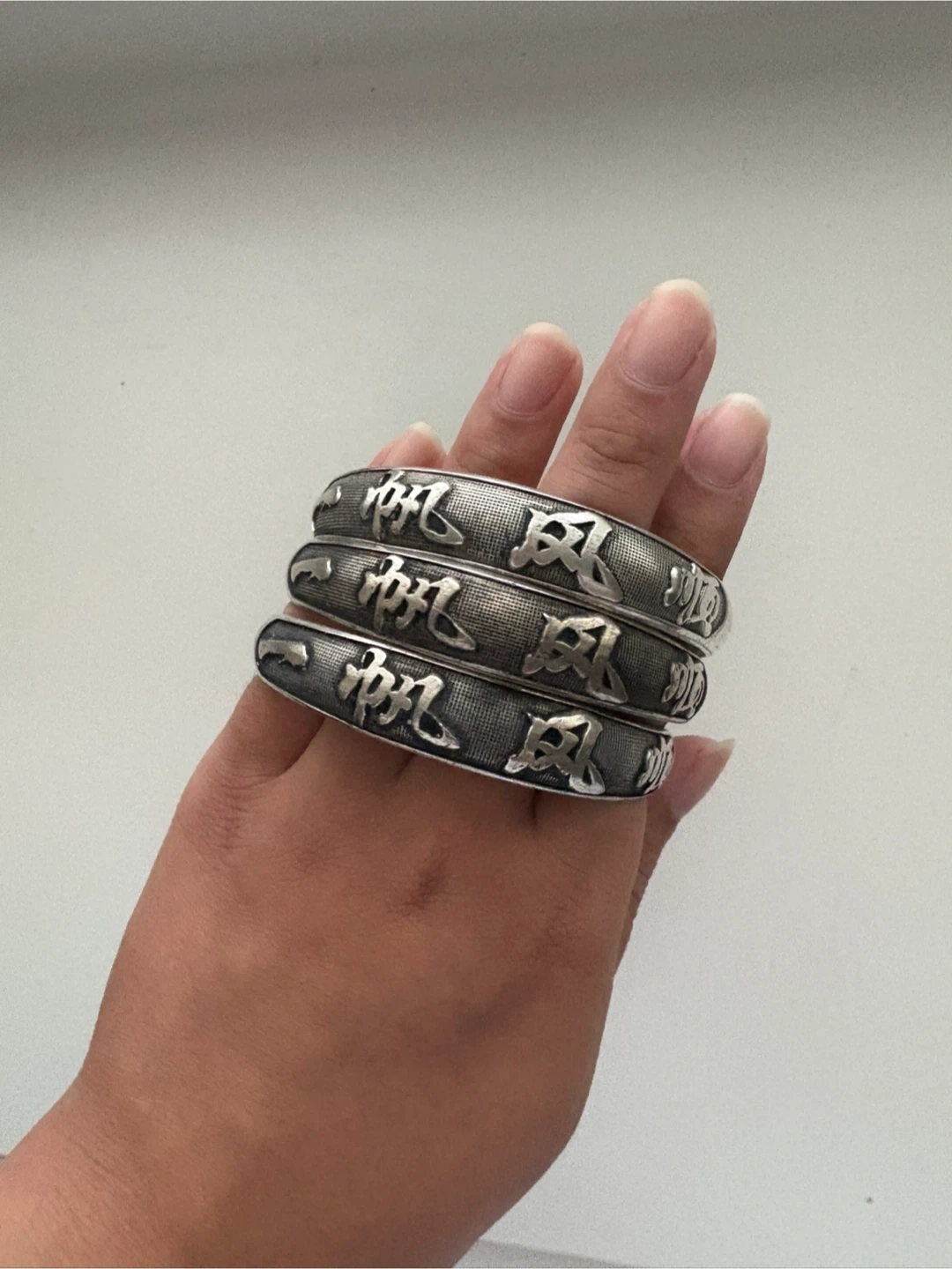 Selling a vintage silver bangle bracelet from the People’s Republic of China 1980s. It features intricate Chinese characters engraved around the band. It weighs 33.5 grams. A unique piece to give to students! 3 In total. 45 Each Can do a deal if you are buying all