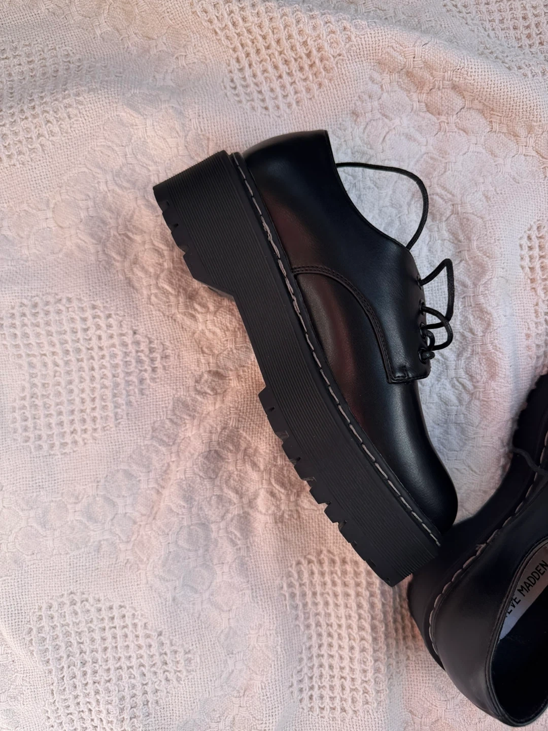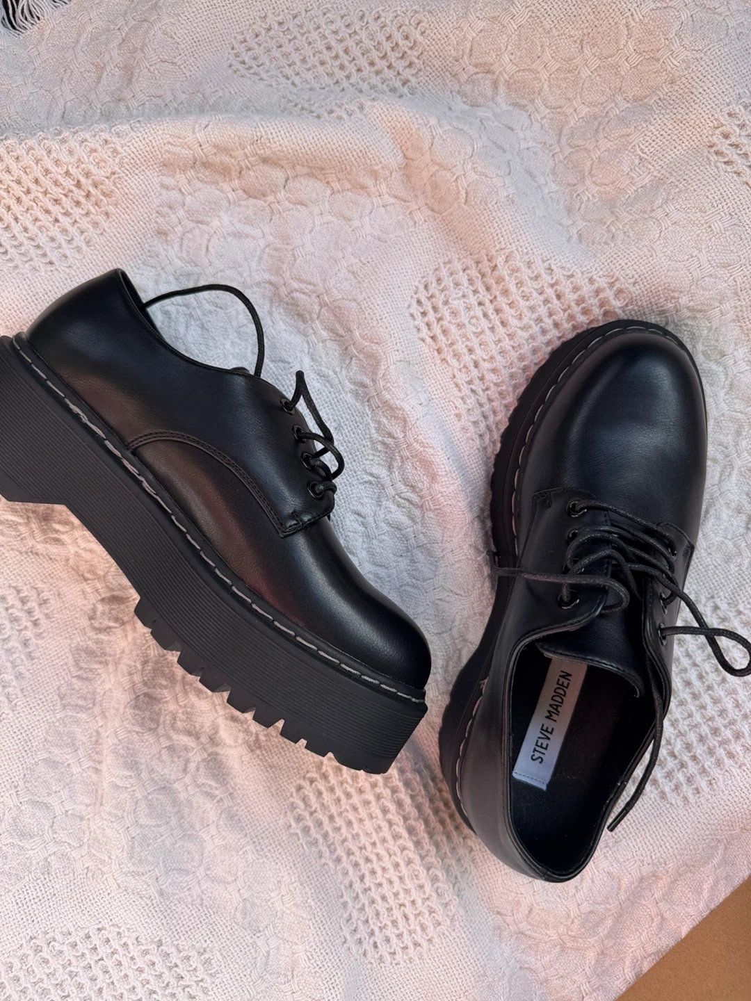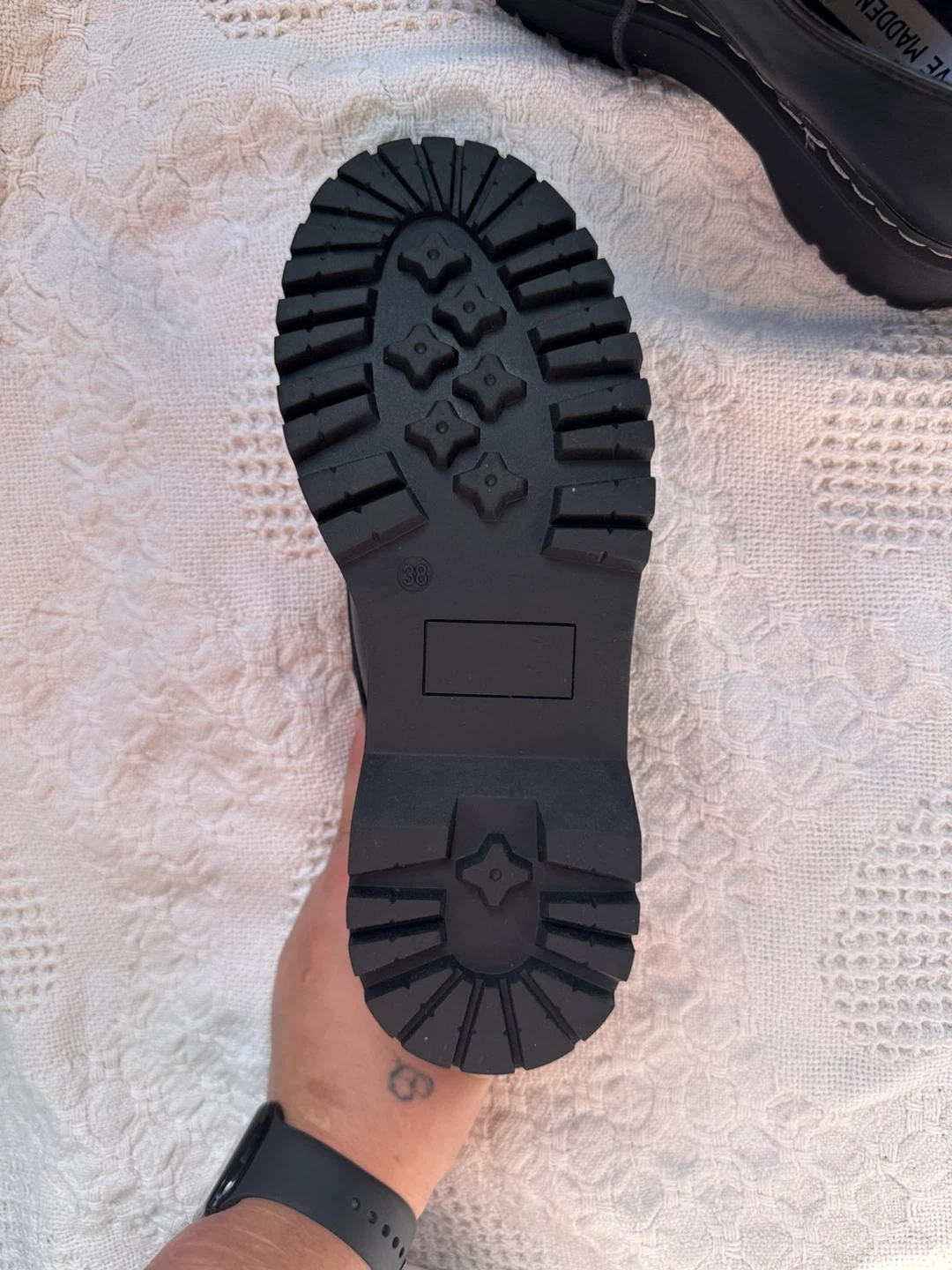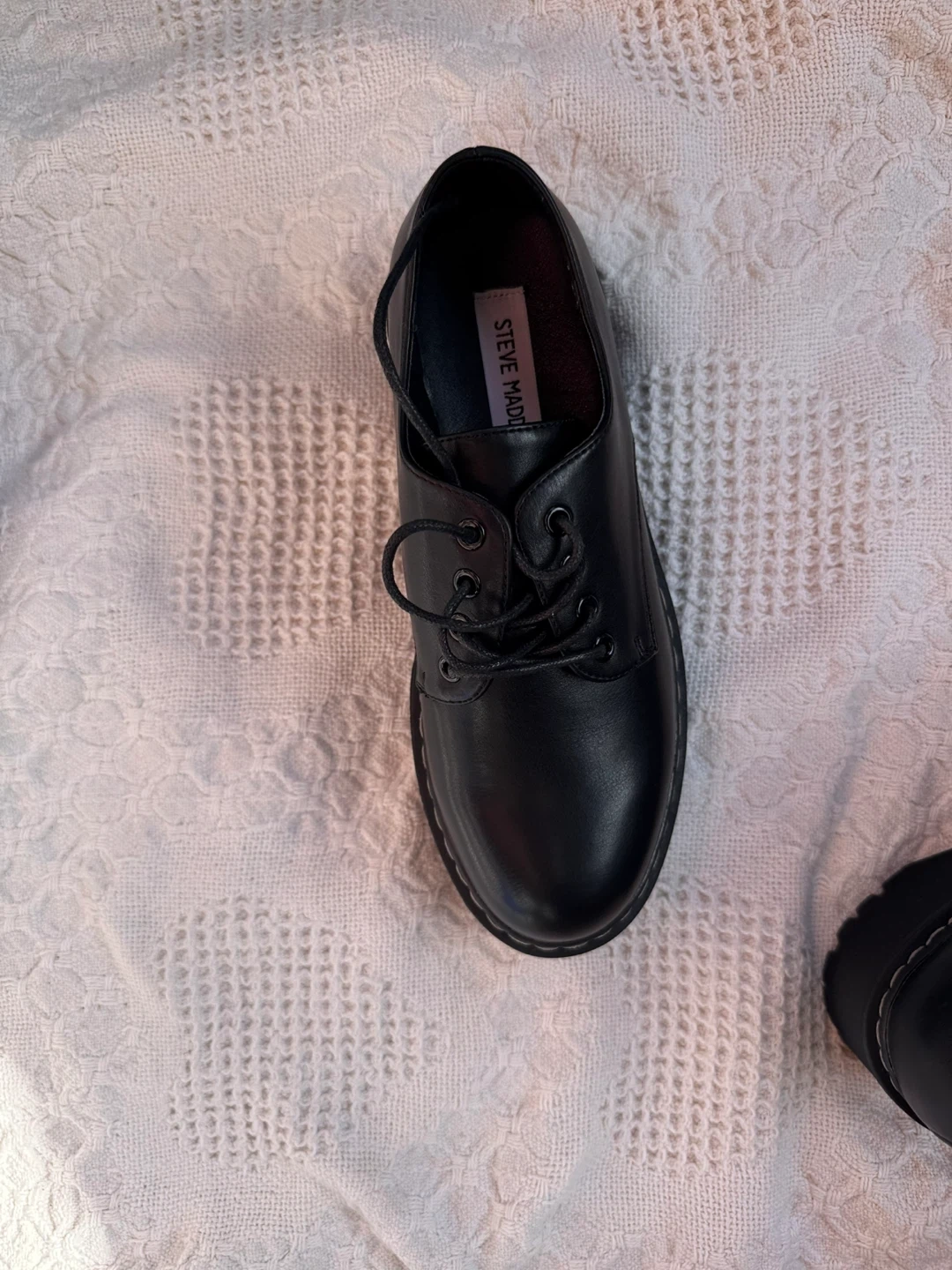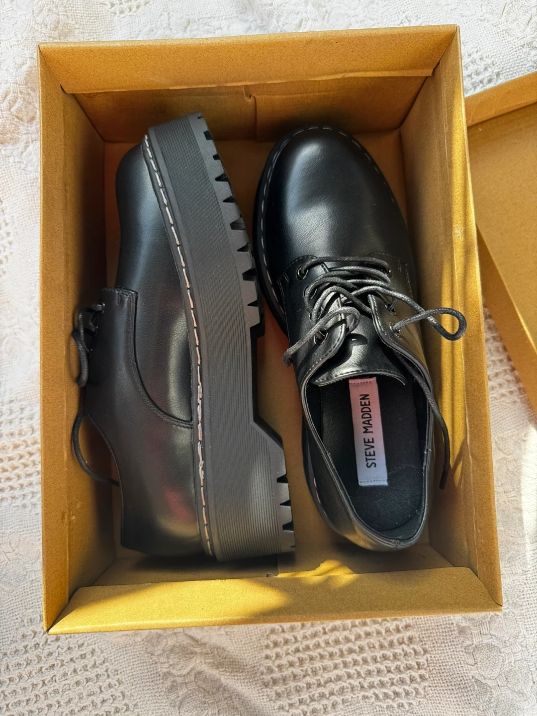 Selling a pair of Steve Madden platform shoes in black! They are in excellent condition and come with the original box. The size is 8 (marked as 38 on the sole). These shoes are super stylish and perfect for adding a bit of edge to any outfit! They have never been worn.