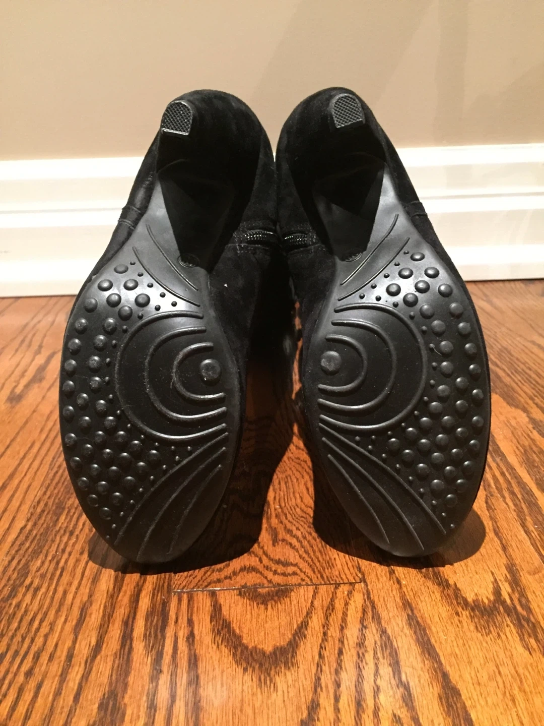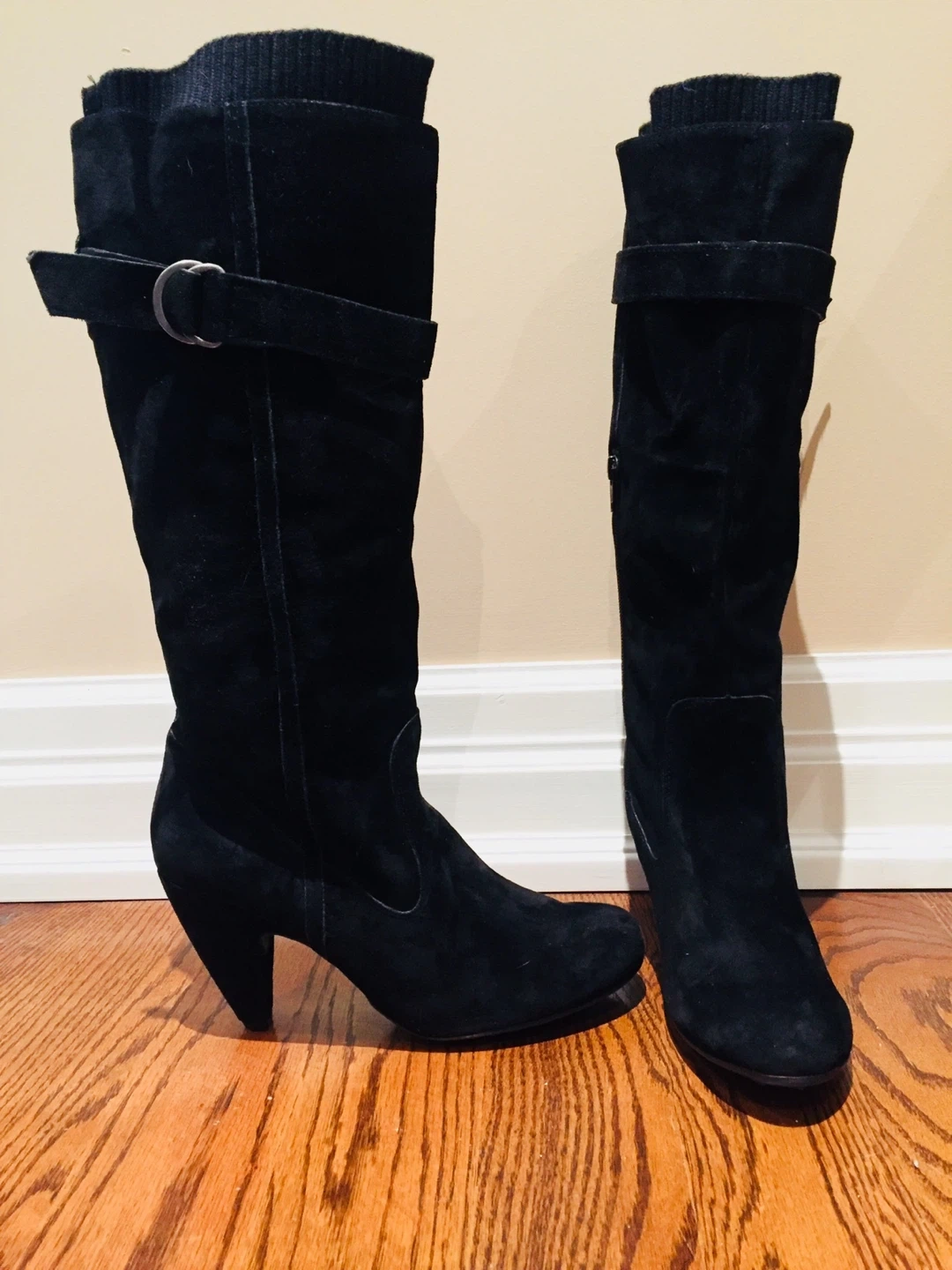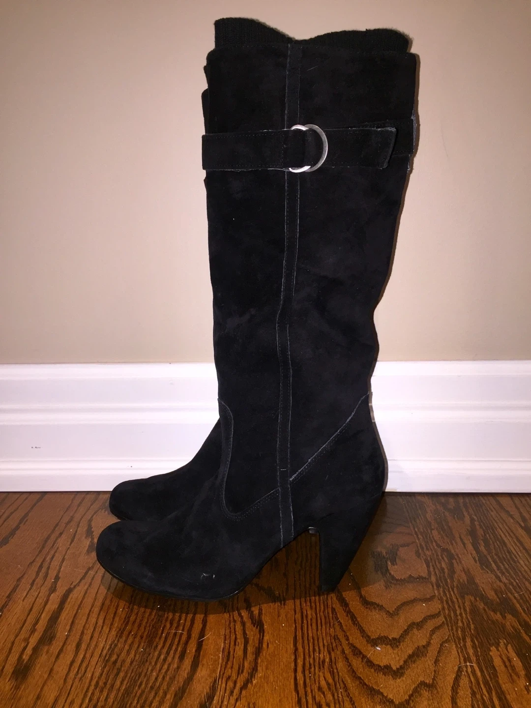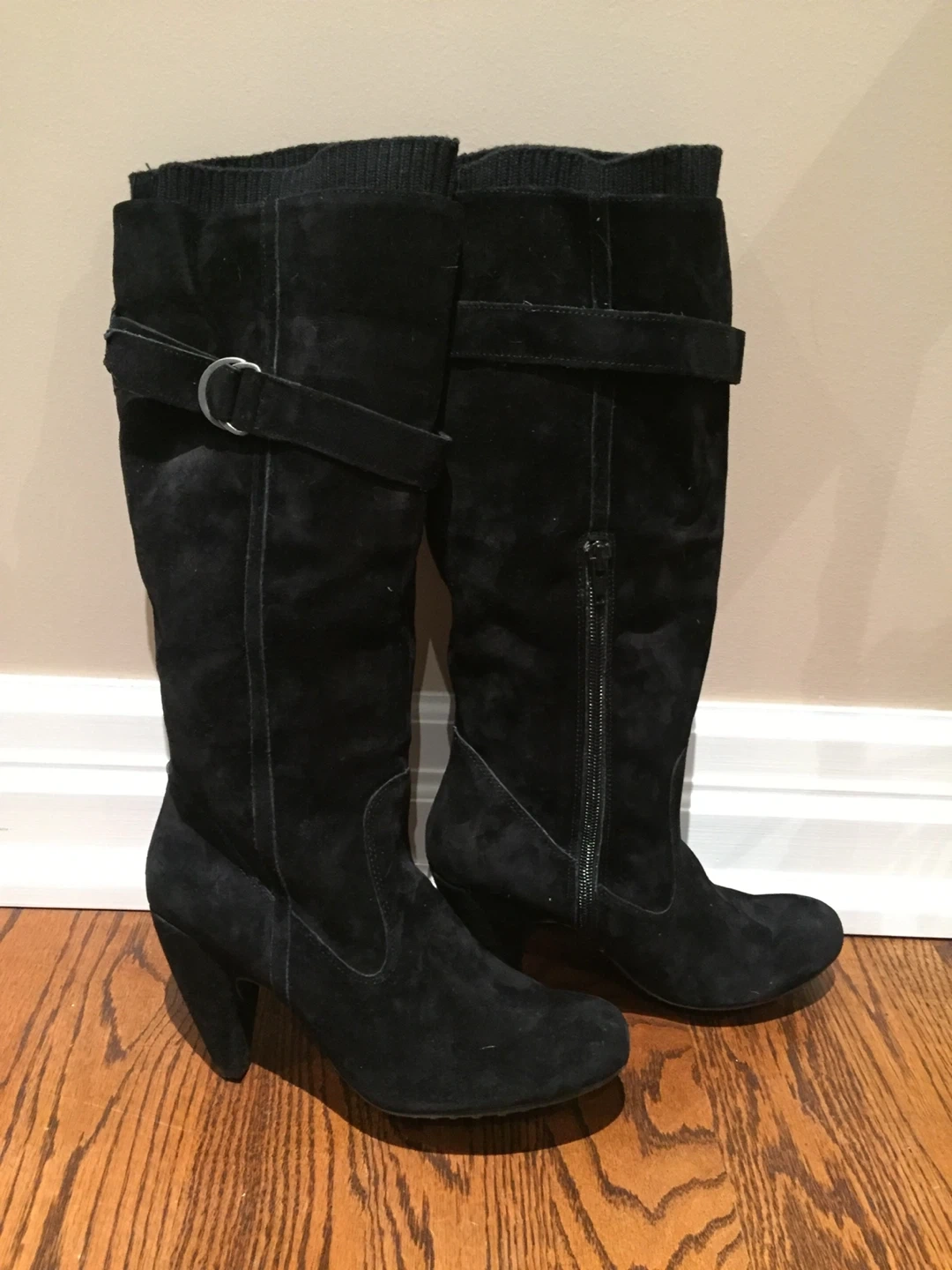 Selling a pair of black suede boots. They're brand new and have never been worn! They feature a stylish buckle detail and a comfortable heel height. Perfect for adding a touch of elegance to any outfit