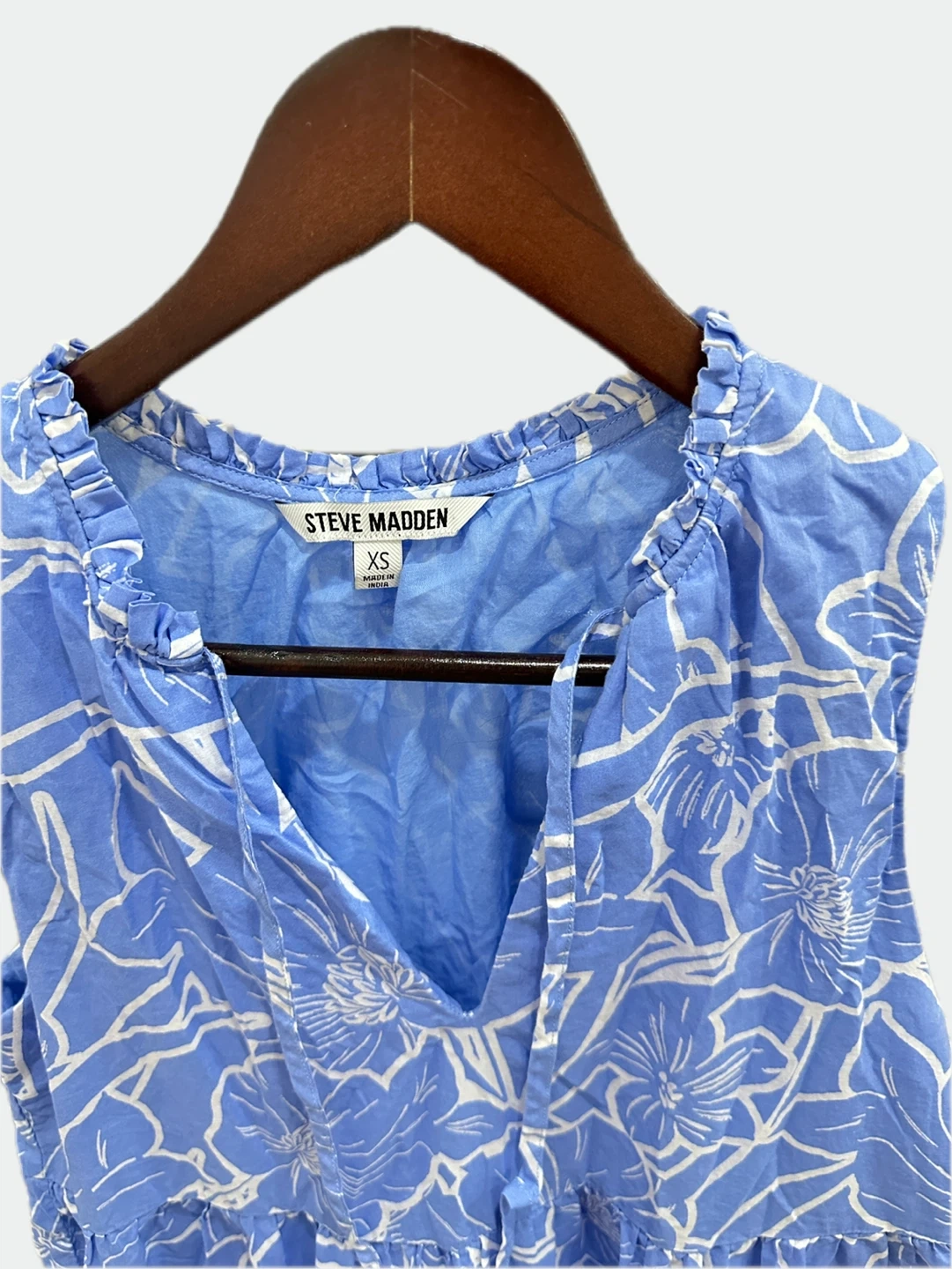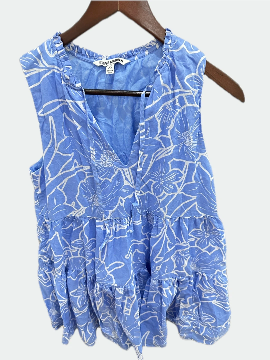 This is a cute Steve Madden sleeveless top in size XS. It features a pretty blue and white floral pattern. Perfect for summer!