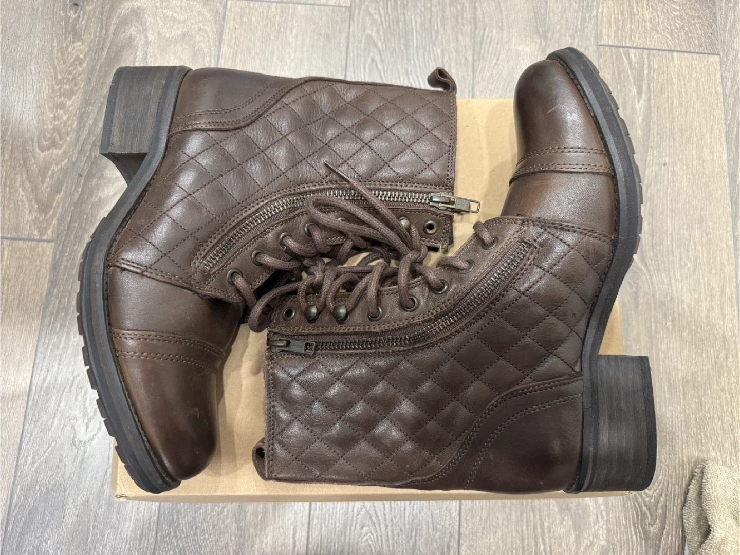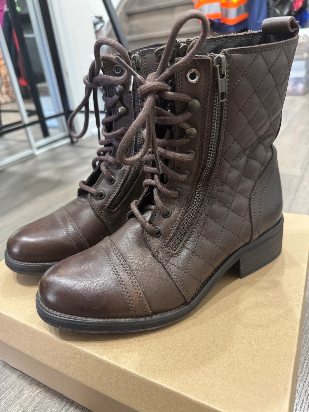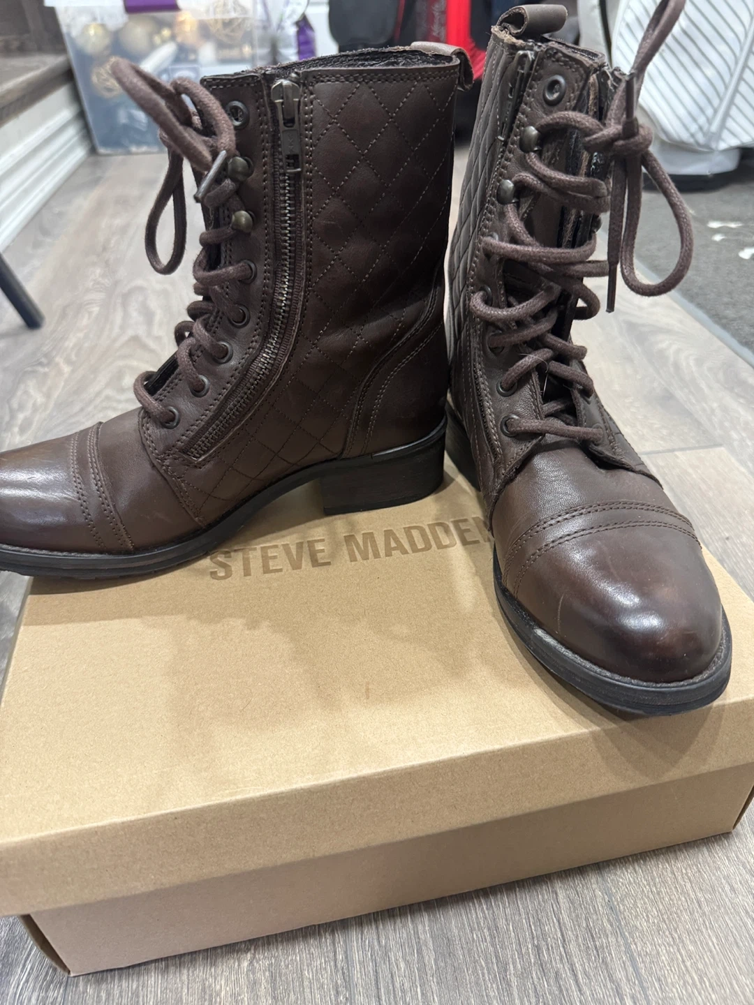 Selling a pair of Steve Madden brown lace-up heeled boots! These stylish boots feature a quilted design and a convenient side zipper. Perfect for adding a touch of edge to any outfit! Small bit of corrosion on eyelet as shown. Otherwise in good condition. Hardly worn.