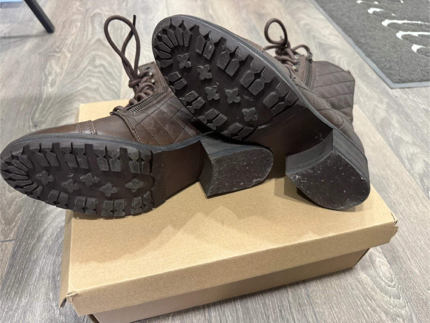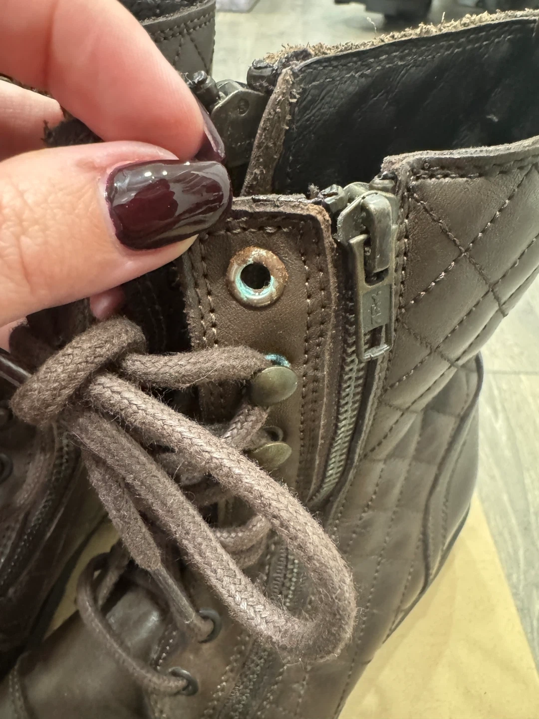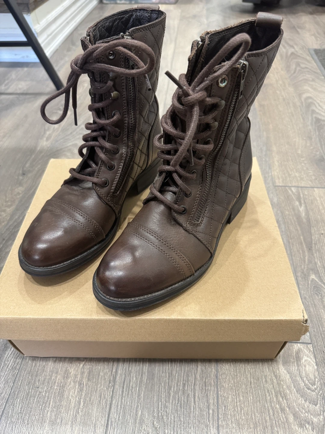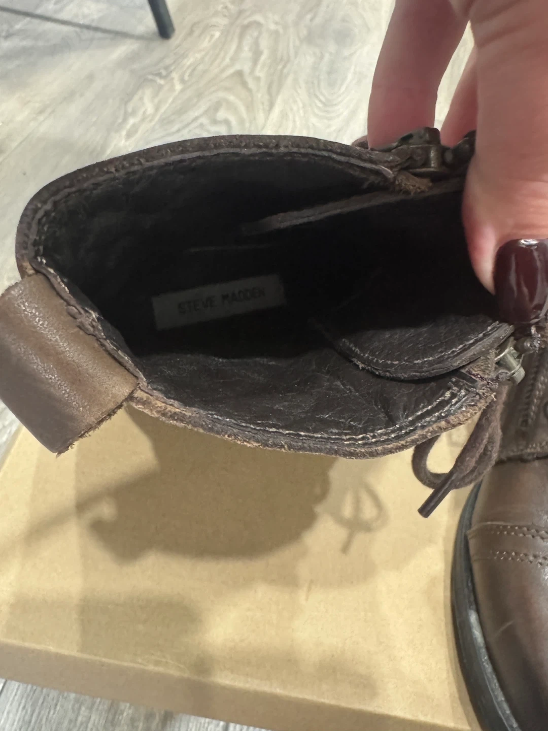 Selling a pair of Steve Madden brown lace-up heeled boots! These stylish boots feature a quilted design and a convenient side zipper. Perfect for adding a touch of edge to any outfit! Small bit of corrosion on eyelet as shown. Otherwise in good condition. Hardly worn.