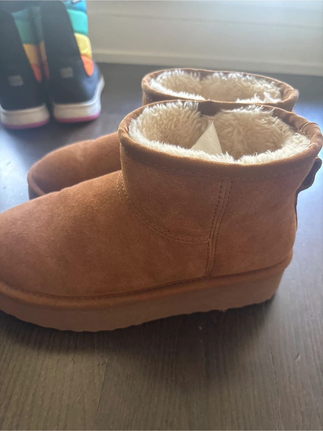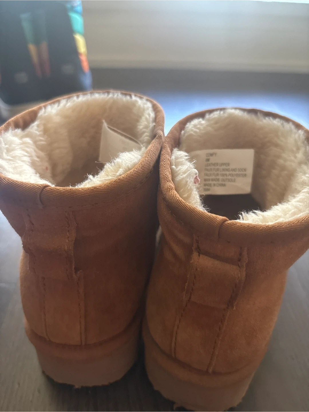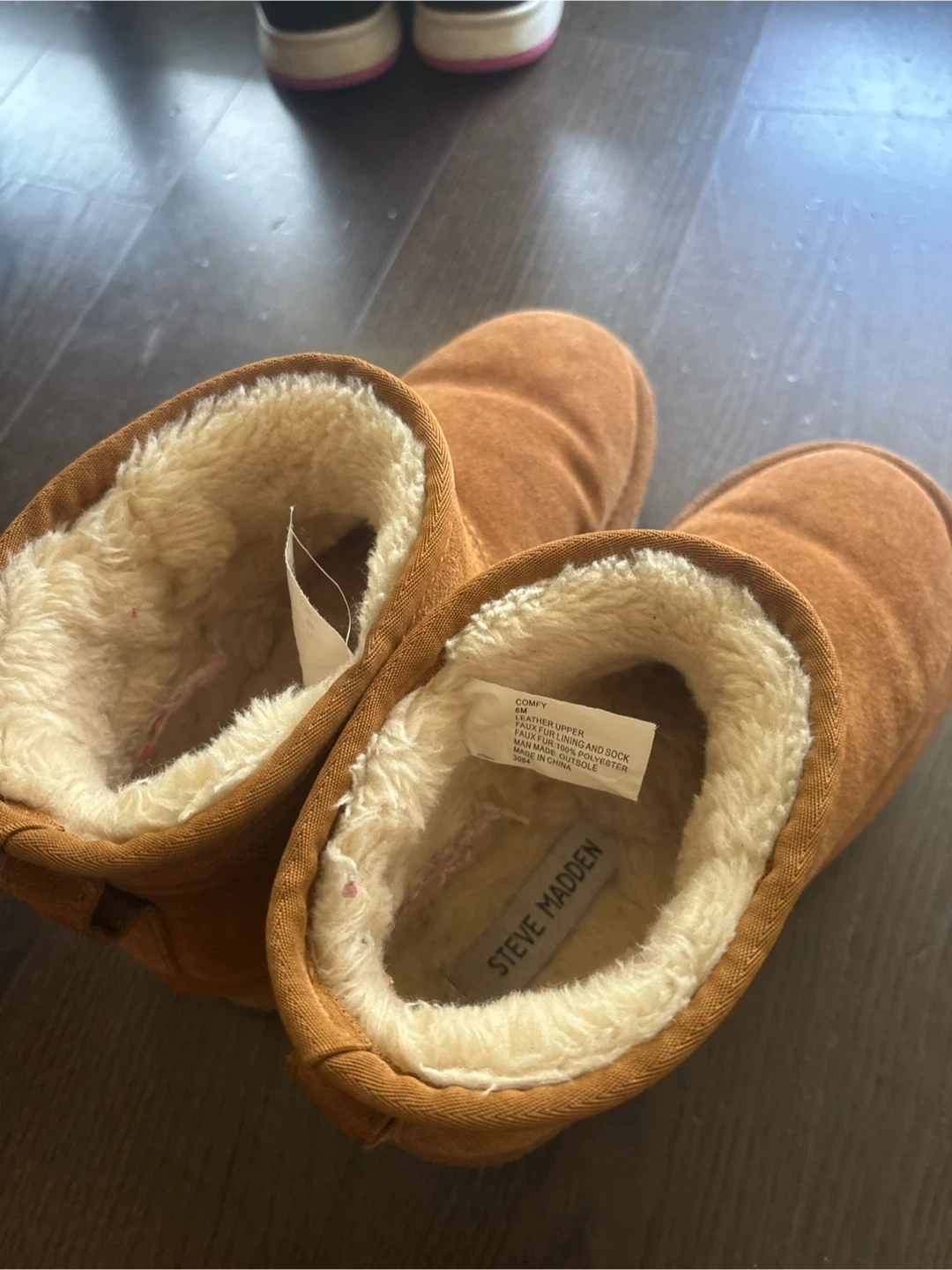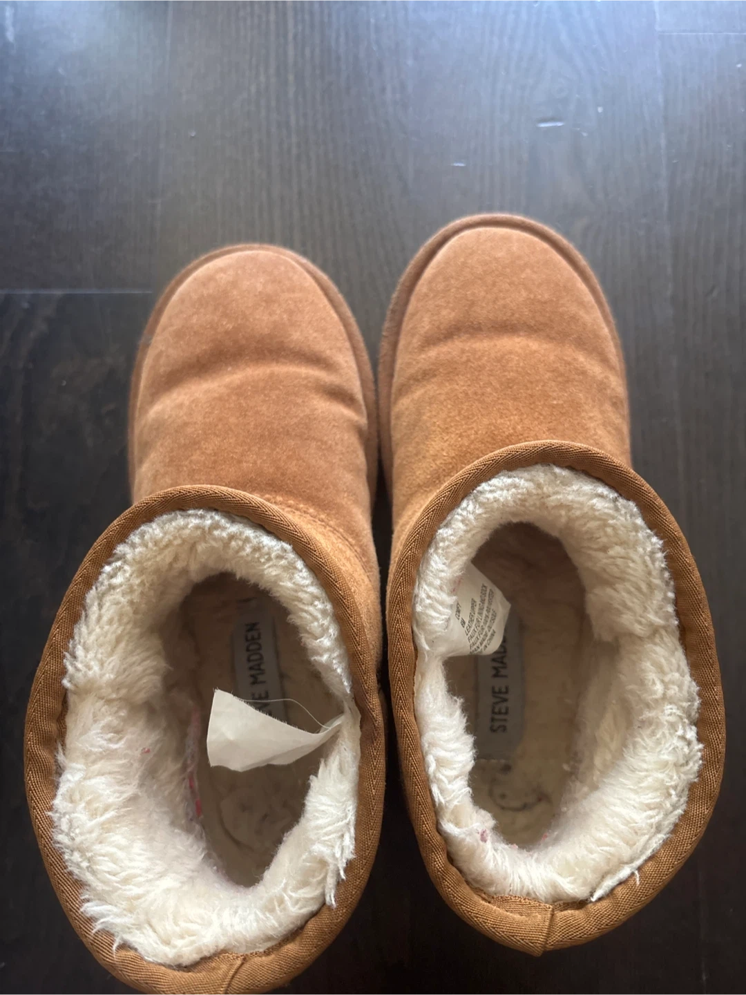 Cozy Steve Madden Comfy boots in a lovely brown suede! These are perfect for keeping your feet warm and comfy during the colder months. They're made with a leather upper and faux fur lining, so they're super soft and snug