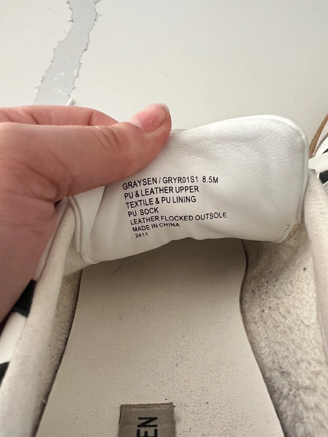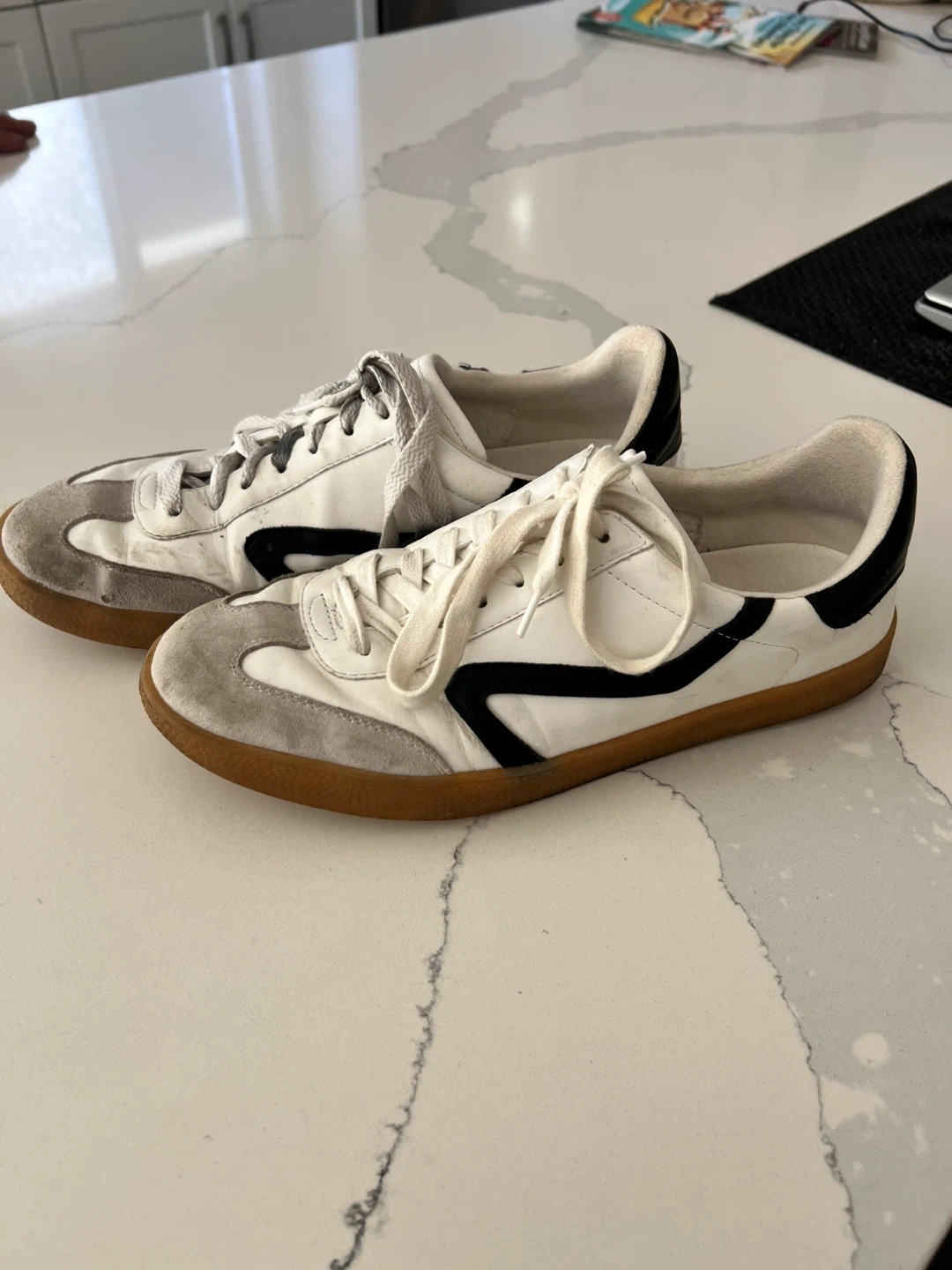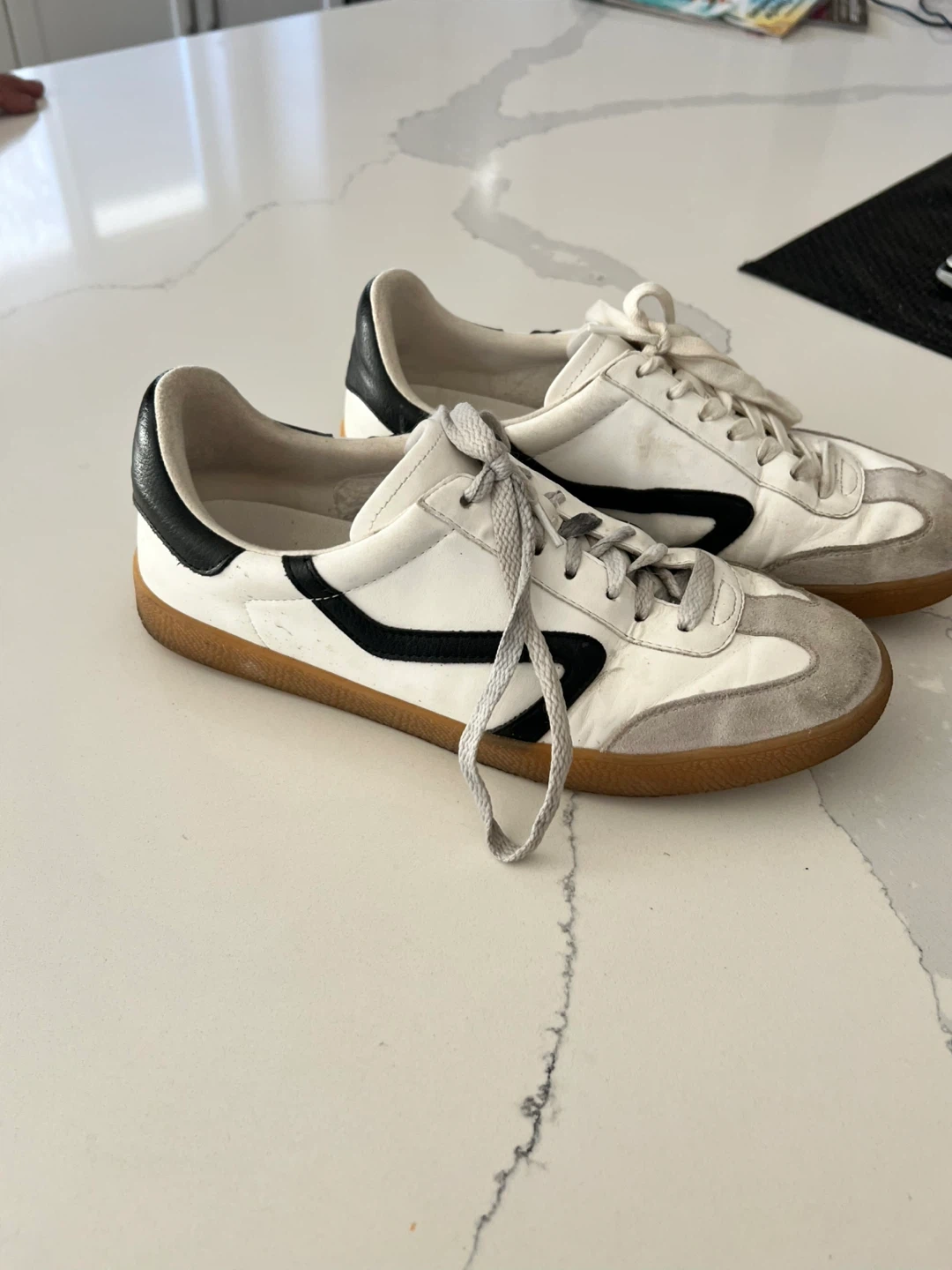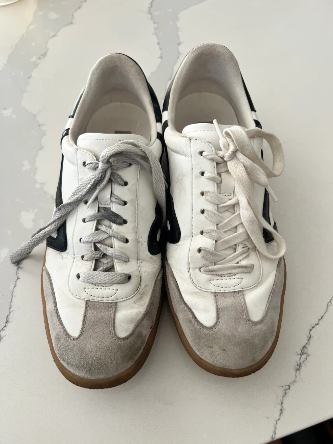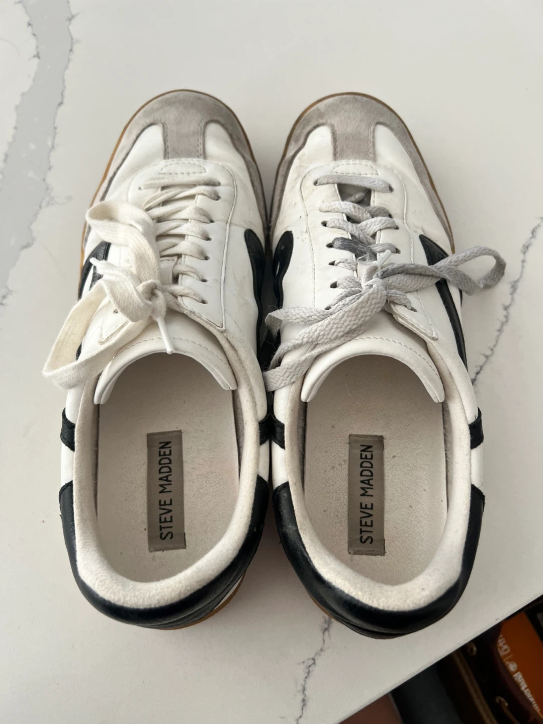 Selling a pair of Steve Madden Graysen sneakers in size 8.5. They feature a white PU and leather upper, textile and PU lining, and a PU sock. The outsole is leather flocked. They show some signs of wear, but still have lots of life left! One of the shoe laces broke, hence the dirty old one