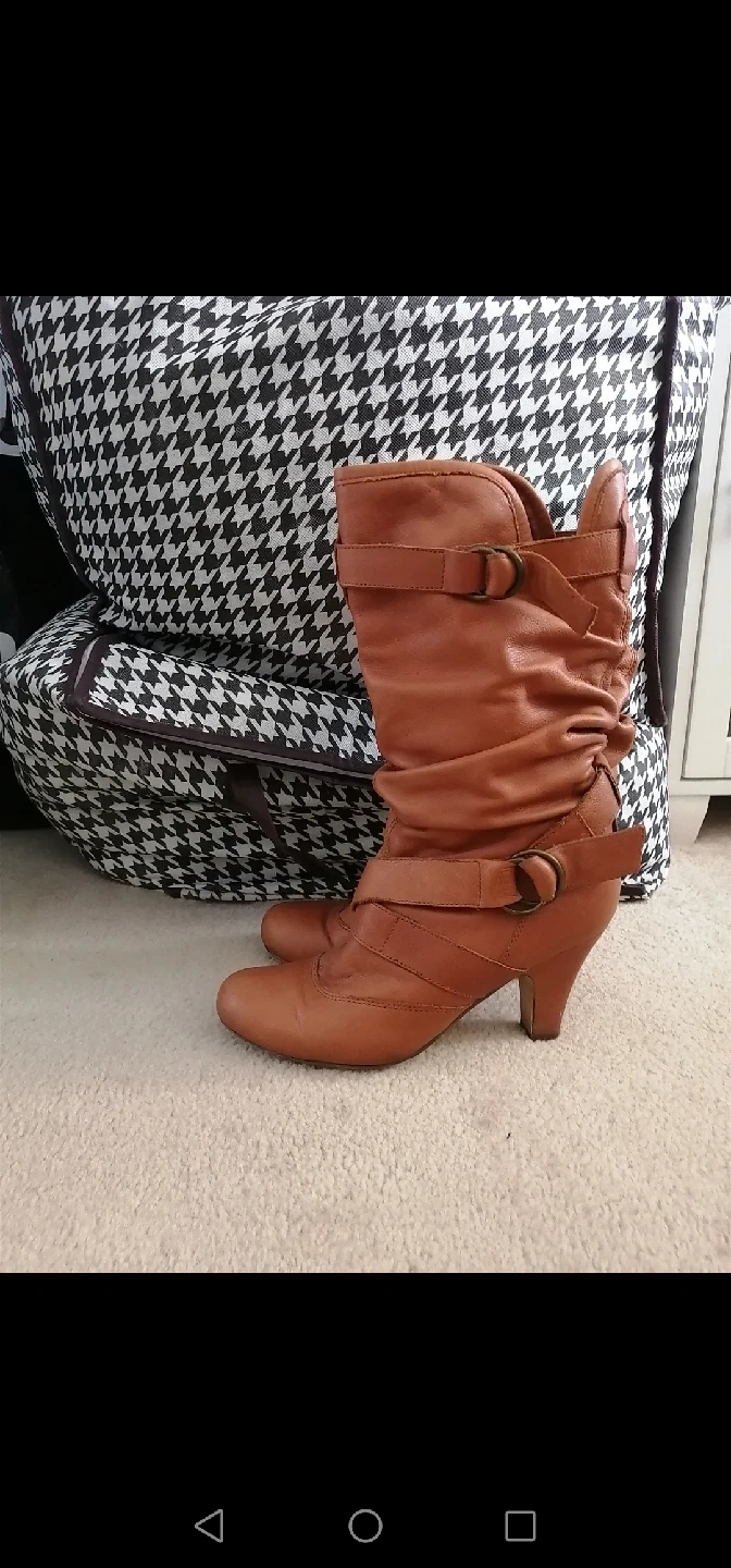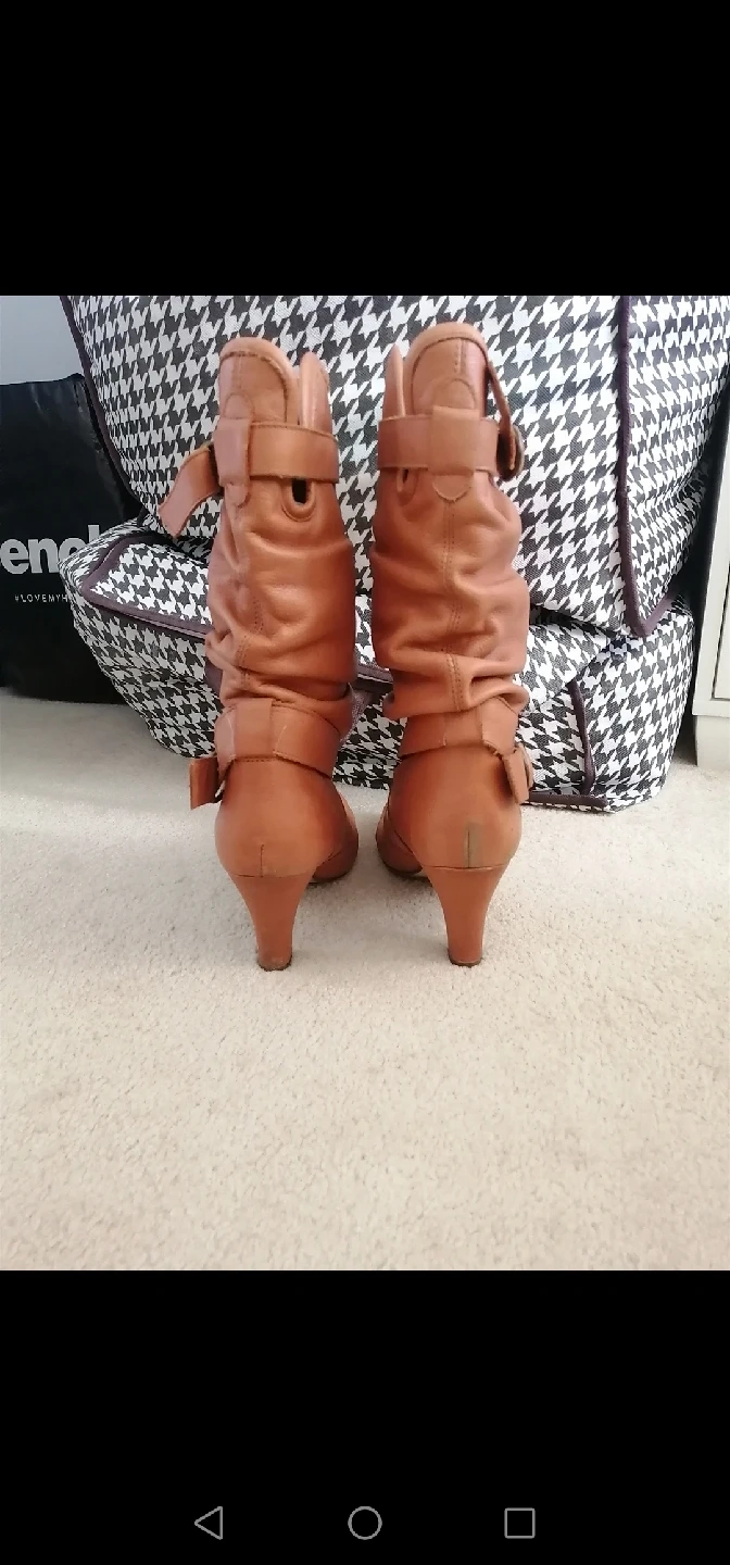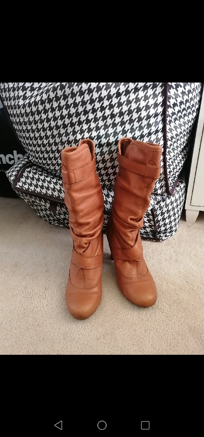 The Steve Madden boots have a leather upper and a man-made balance. These stylish boots are perfect for adding a touch of flair to any outfit! Size 8 but feels like a size 7.5.