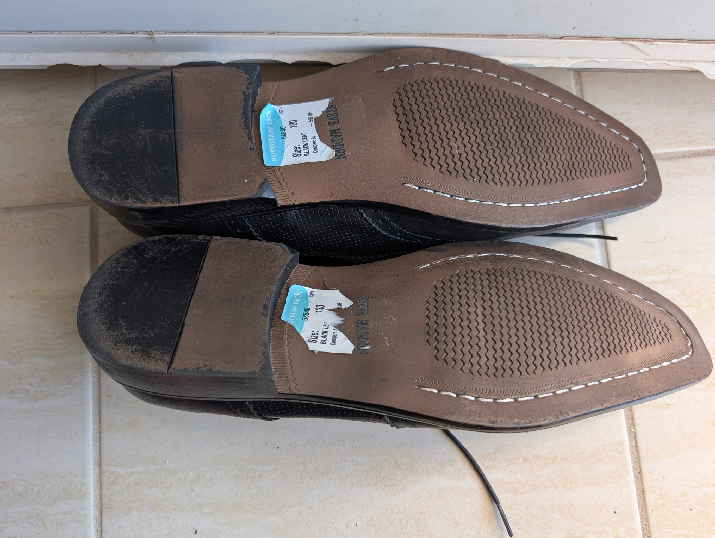 Selling a pair of Steve Madden P-Lander dress shoes in black leather. These are a men's size 13. The upper is leather and the balance is man-made. They're in good condition and ready for a new home!