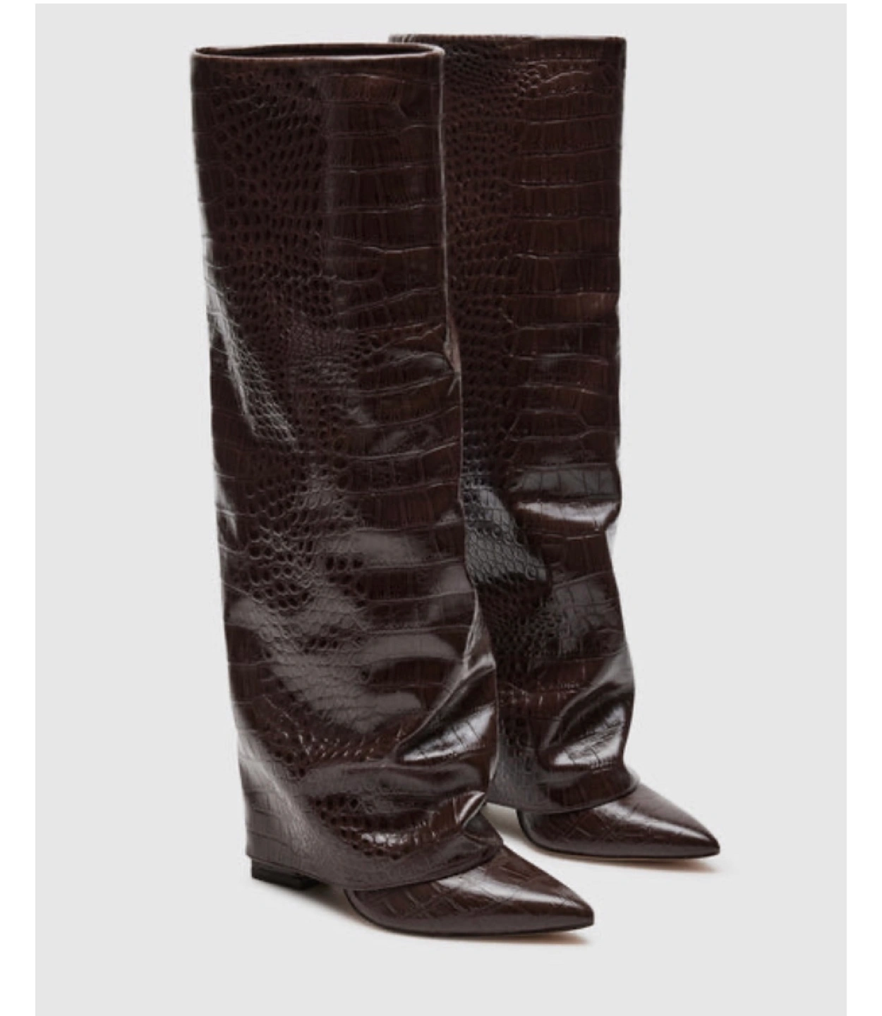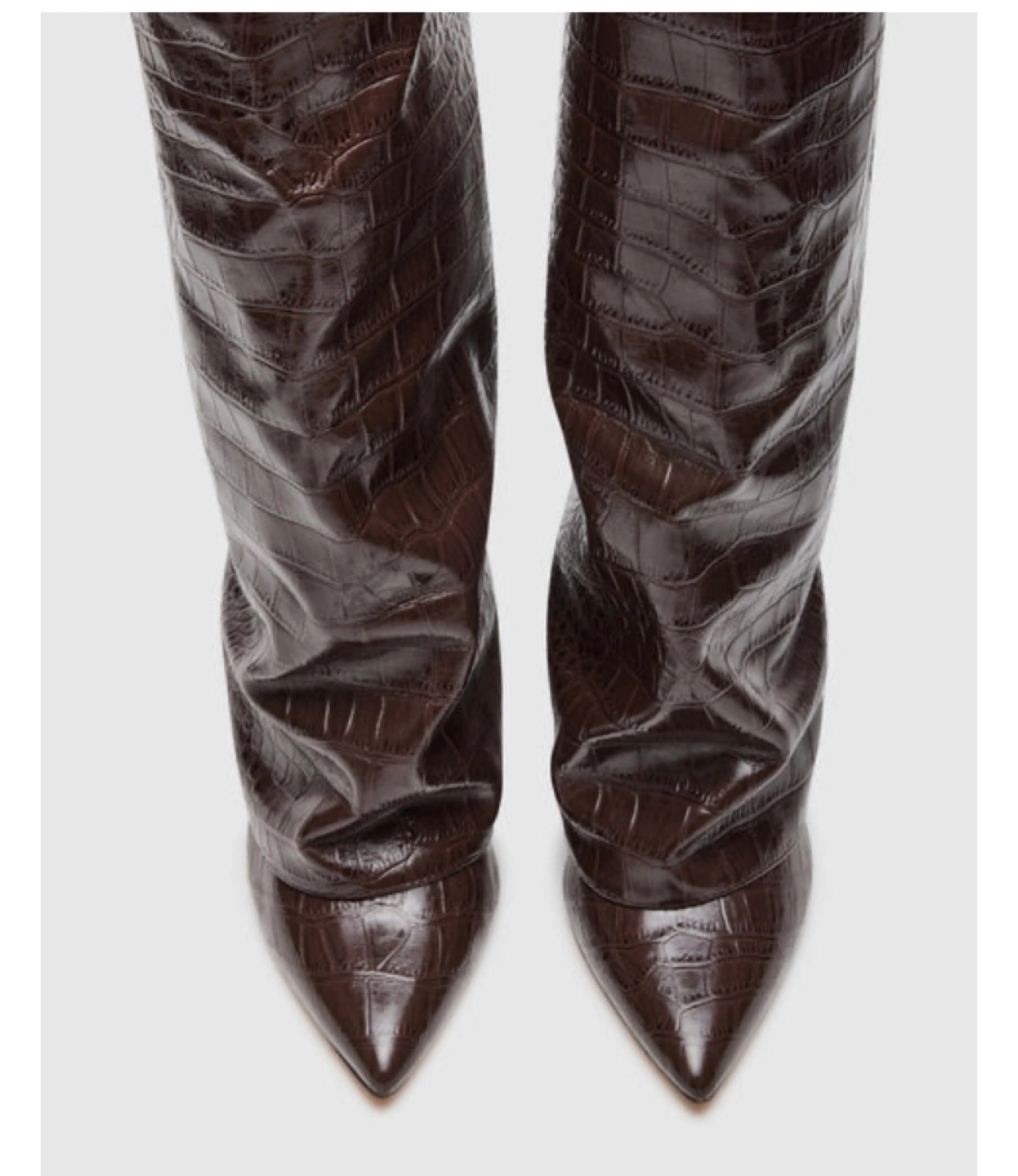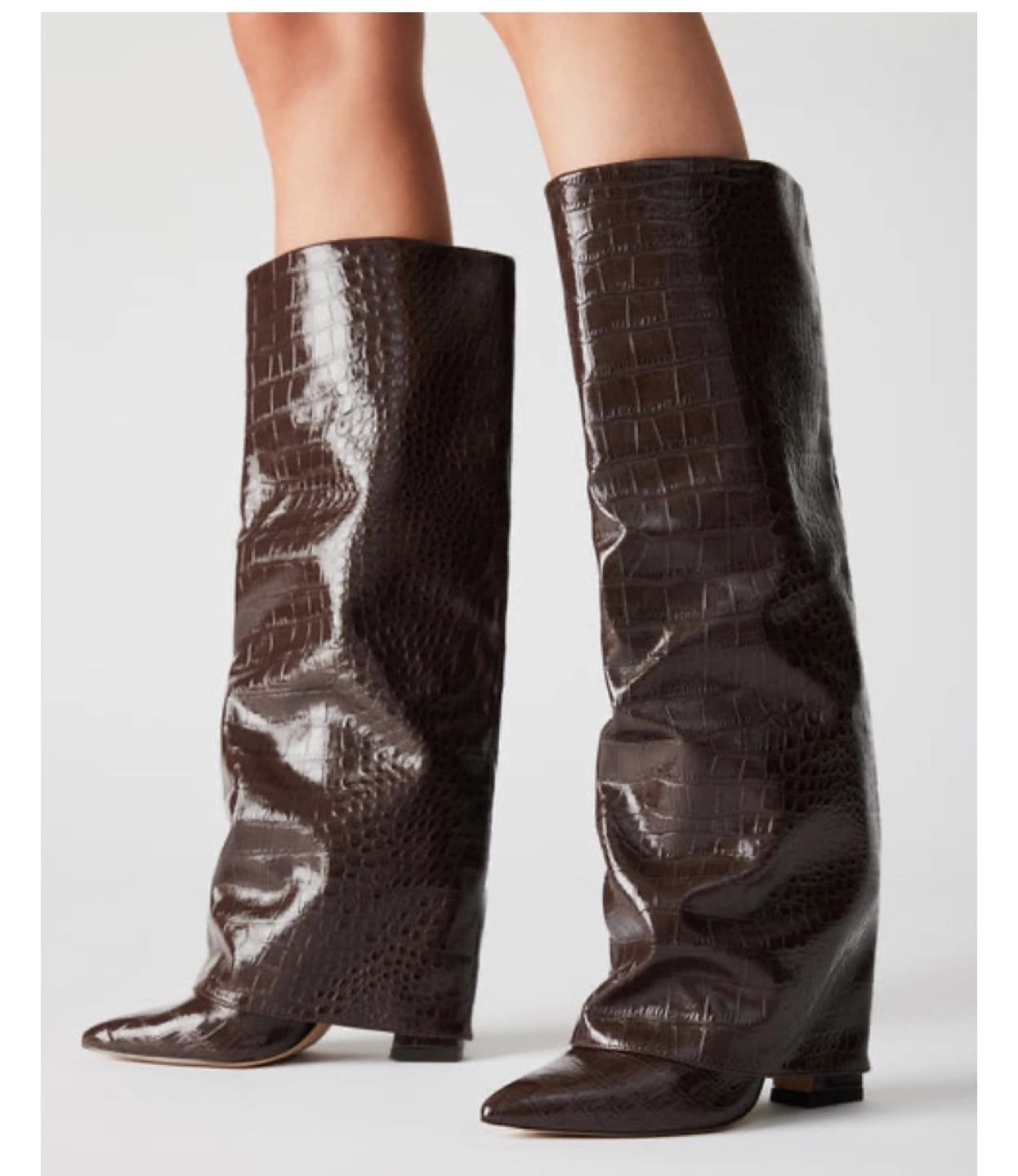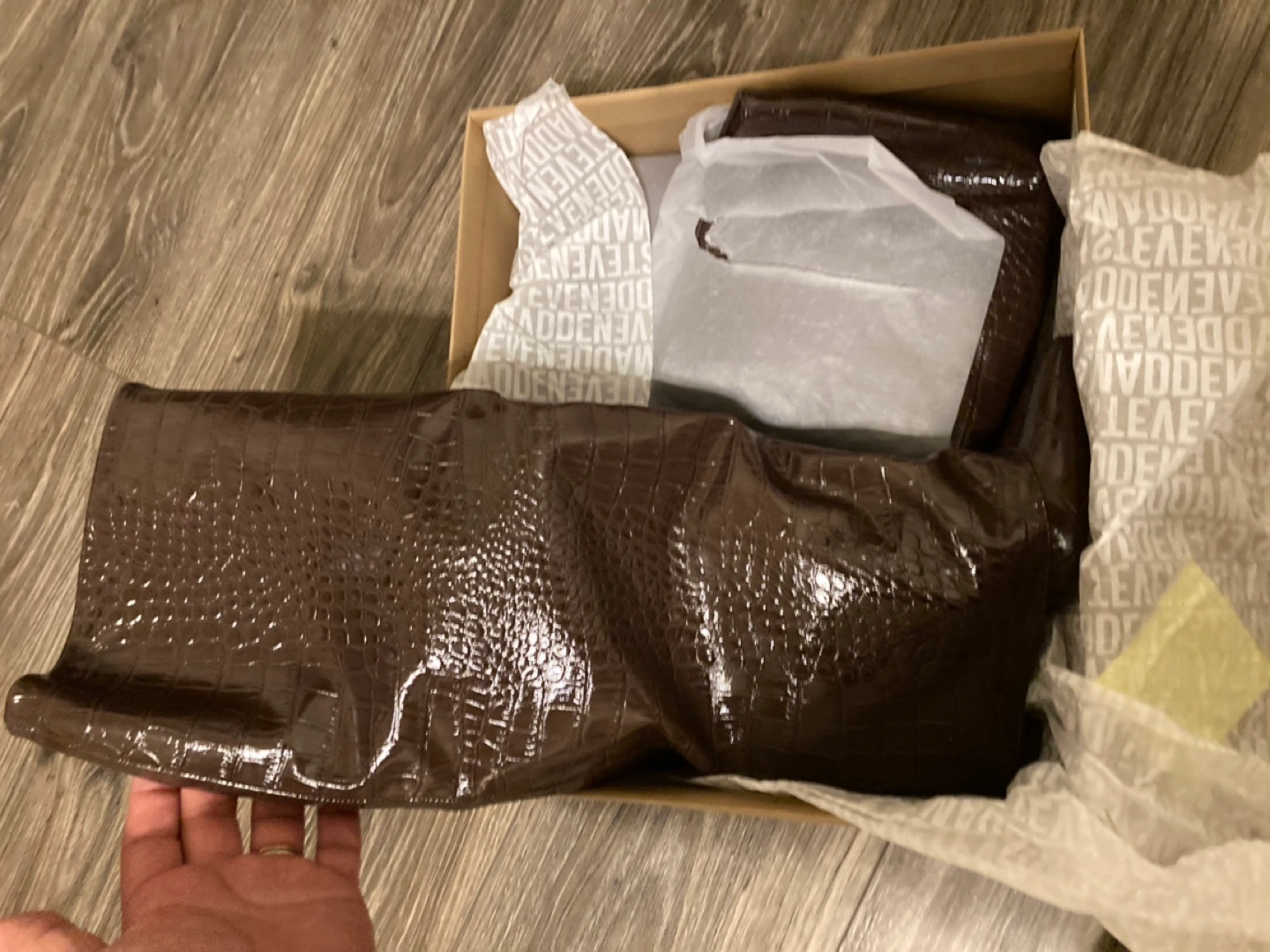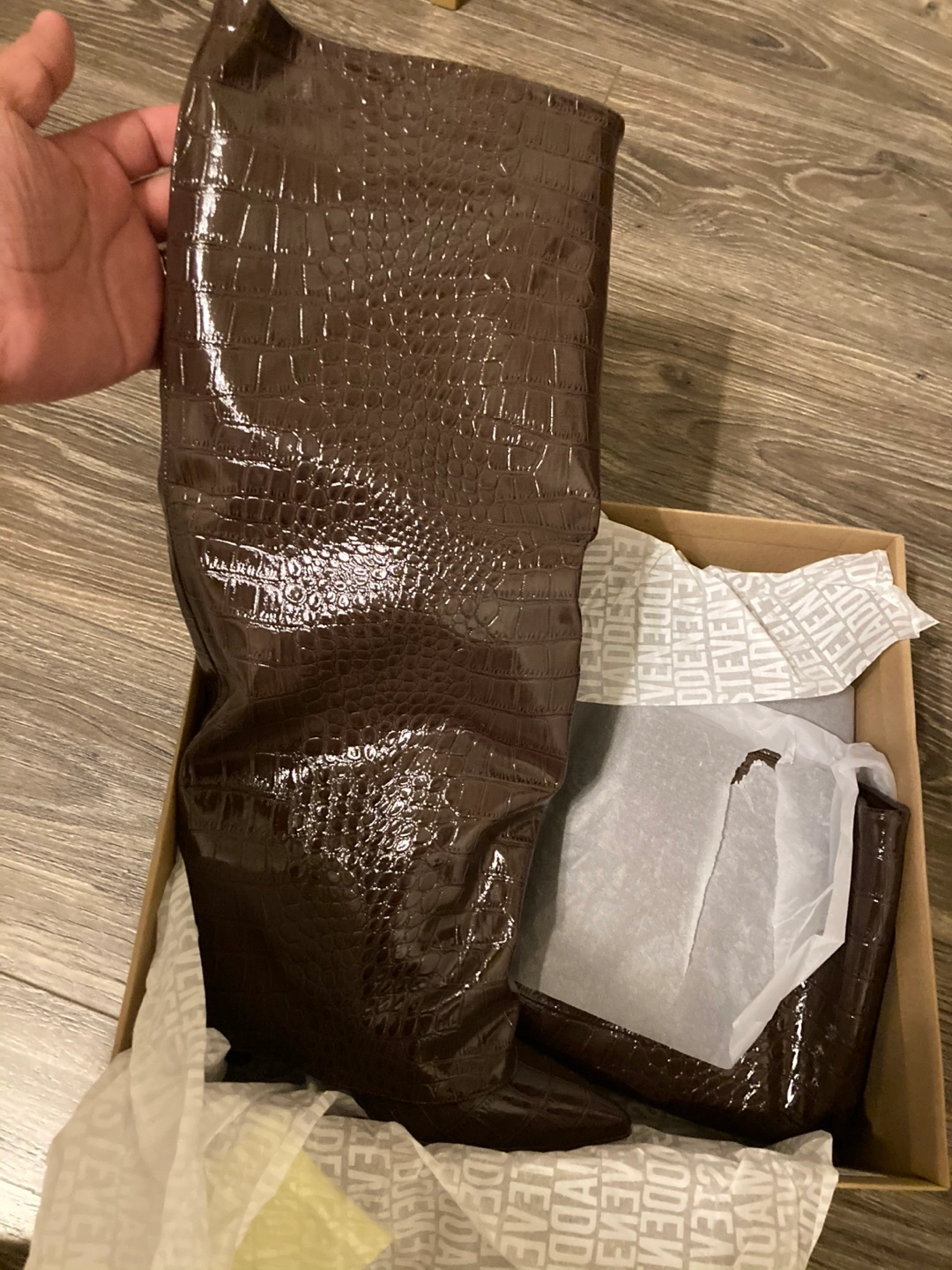 Brand new Stunning Steve Madden knee-high boots. Brown, crocodile-embossed leather. Pointed toe. Comes in original box. Excellent condition. Size 8