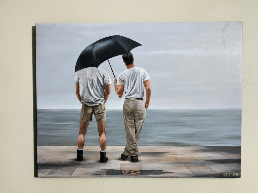 Steve Walker (1961–2012), a Canadian-born painter known for expressive portraits of men, often exploring gay life, love, loss, and identity. The print is named "Rain". 28"W x 31.5"H