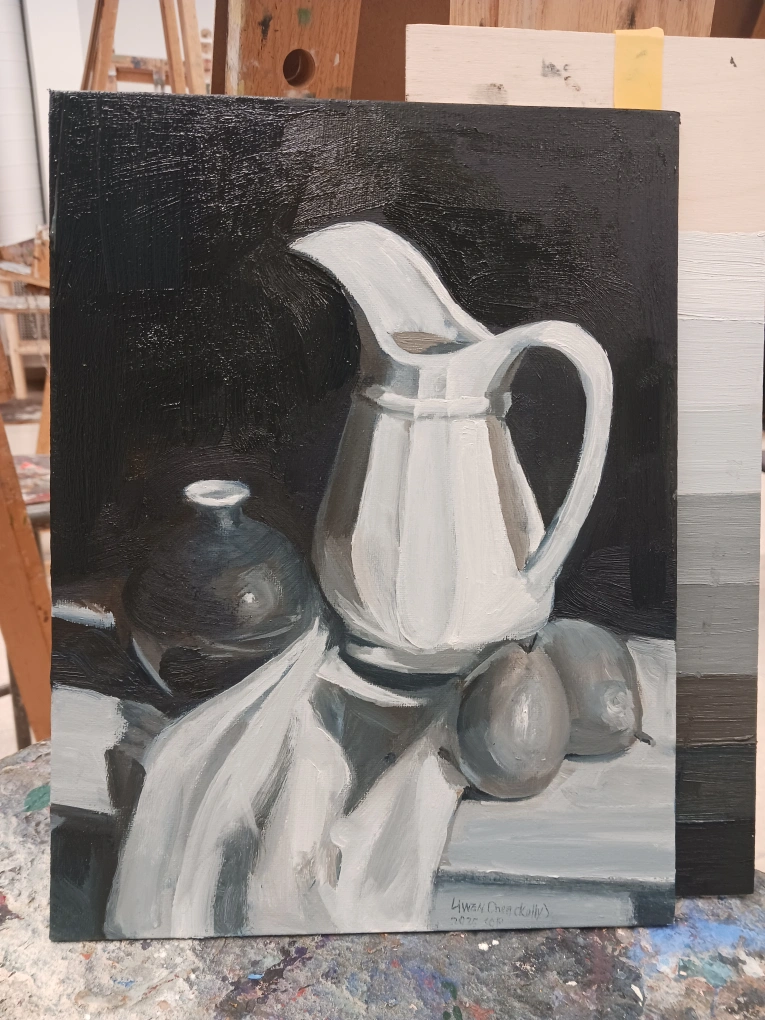 A beautiful still life oil painting, perfect for adding a touch of elegance to any room! The painting features a silver pitcher, a dark vase, and two pears on a white cloth, all rendered in shades of grey. The artist's signature on the corner and gareentee original artwork ๐