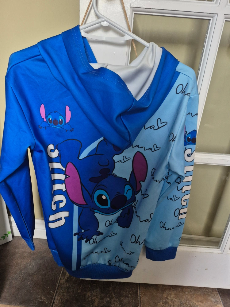 Selling a Stitch hoodie! It's in great condition and features a fun design with Stitch graphics The hoodie is a vibrant mix of blues, making it a standout piece for any Disney or Stitch fan Fits like a loose med youth