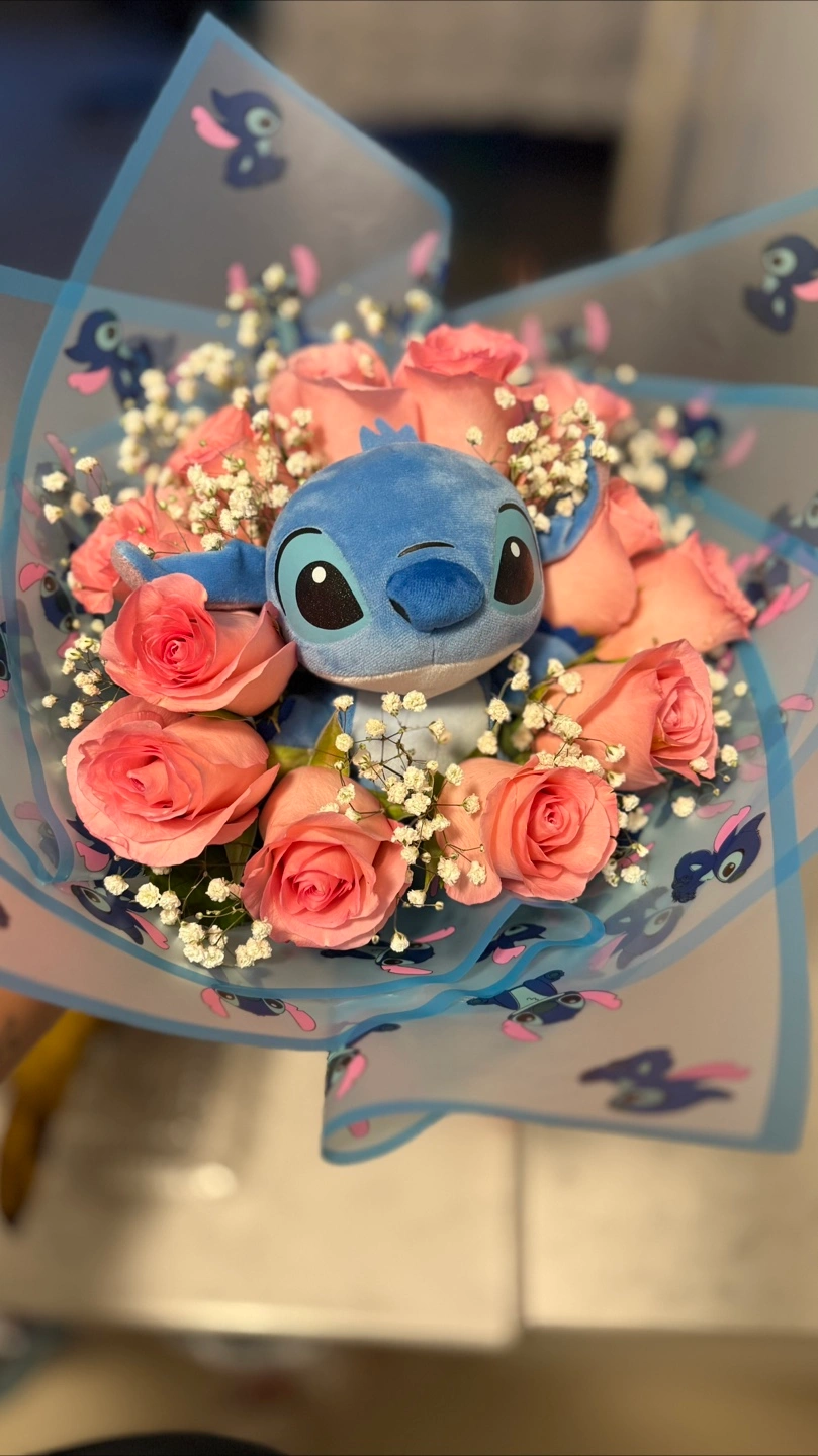 This adorable bouquet features a Stitch plush surrounded by beautiful pink roses and delicate baby's breath. It's perfect for a special occasion or just to brighten someone's day!