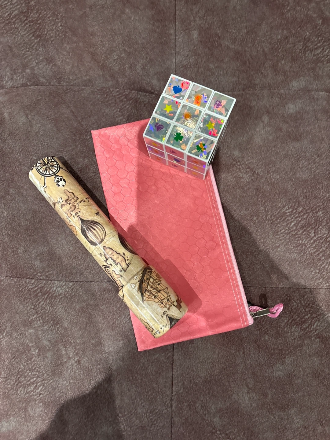 Selling a cute kaleidoscope with a map design, a fun cube puzzle with colourful stickers, and a pink pencil case.
