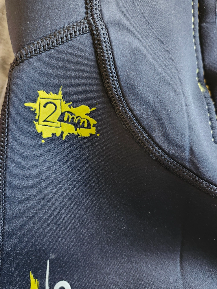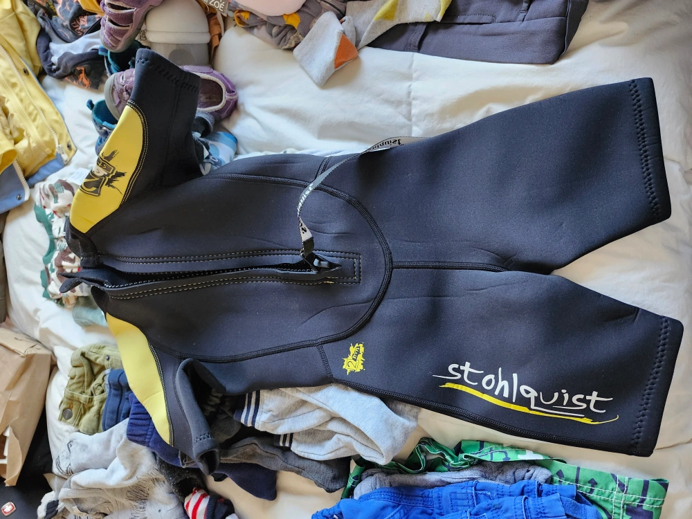 Selling a Stohlquist wetsuit in size small! It's black with yellow accents and made of neoprene. Great for water sports and activities. The material is 100% nylon filling and non-fibrous rubber. Hand wash in cold water and drip dry!