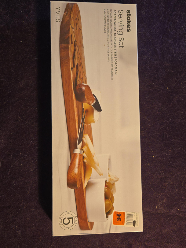 Elevate your serving game with this Stokes Serving Set! This set features acacia wood, stainless steel, and porcelain elements. It includes a stunning wood board with 5 separate serving areas, 2 cheese knives, and 2 versatile bowls. Great for entertaining!