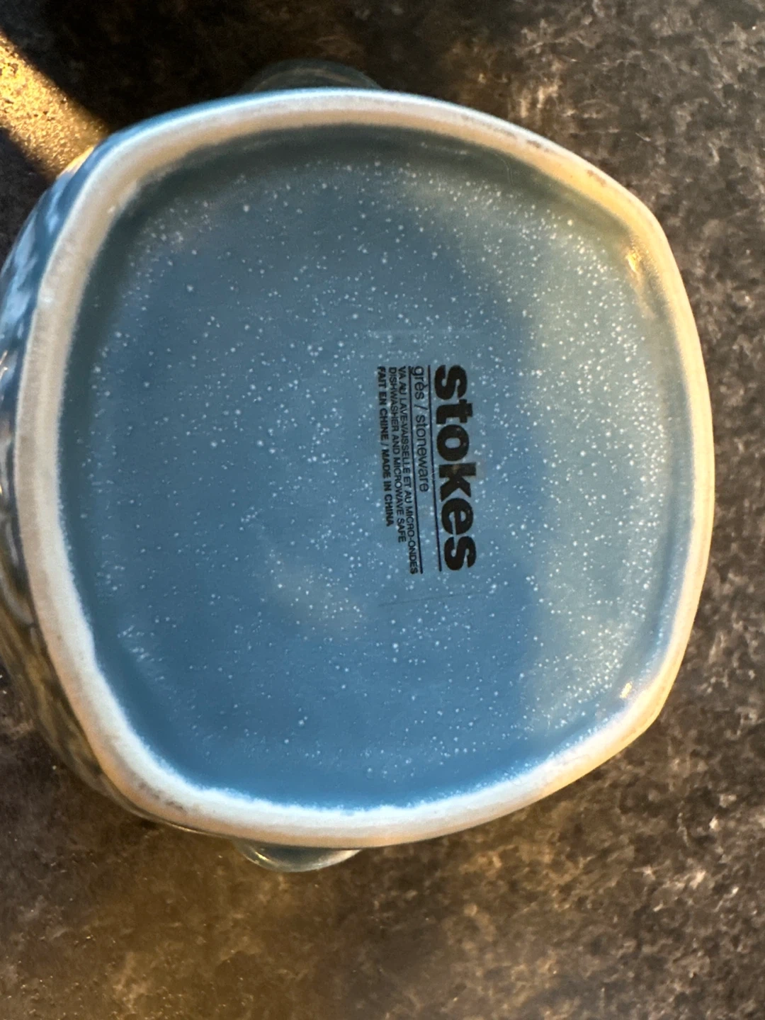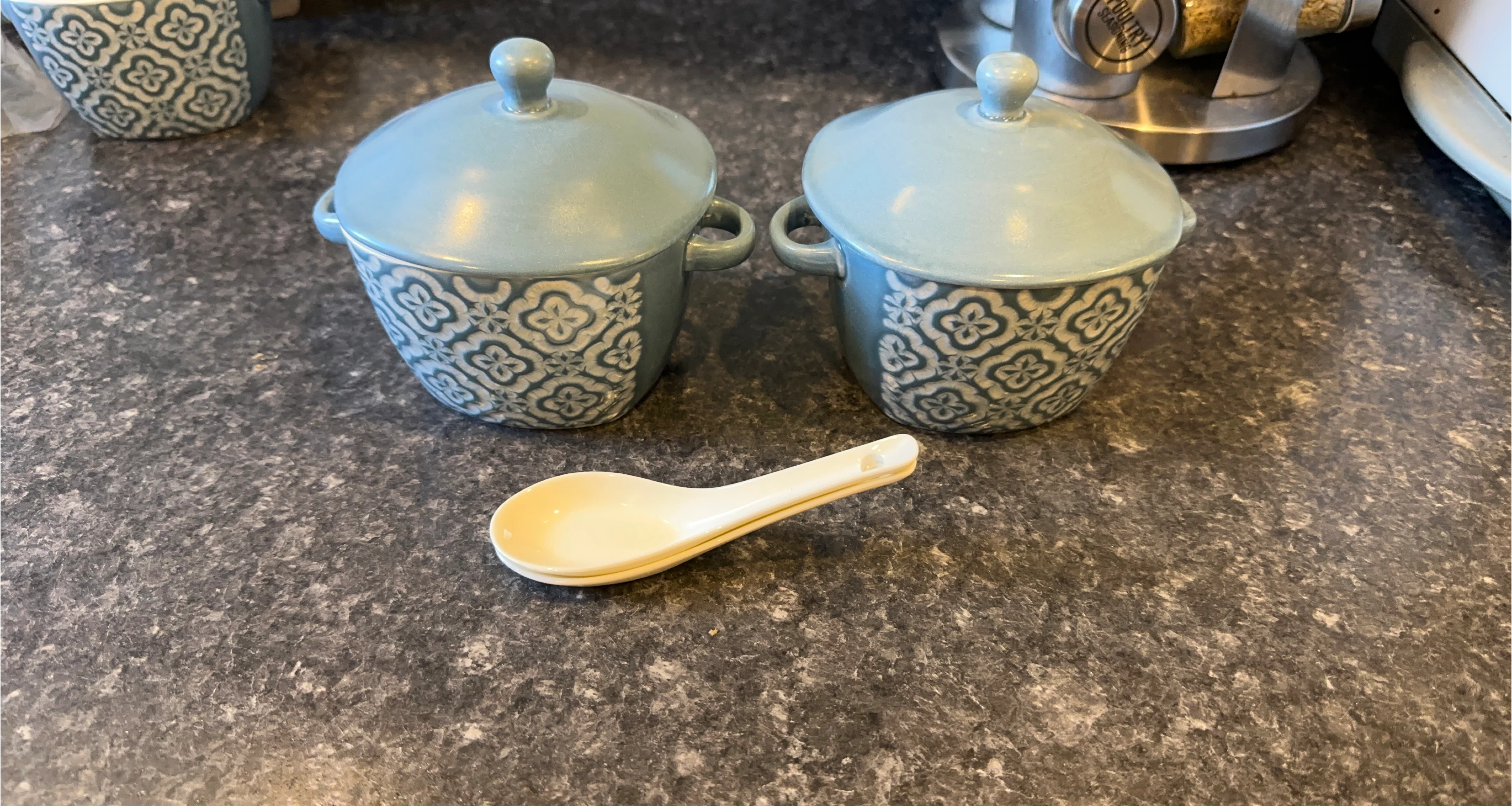 Here are two cute stoneware condiment bowls from Stokes. They come with matching spoons and lids, perfect for dips or spices! The bowls feature a lovely blue and white pattern.