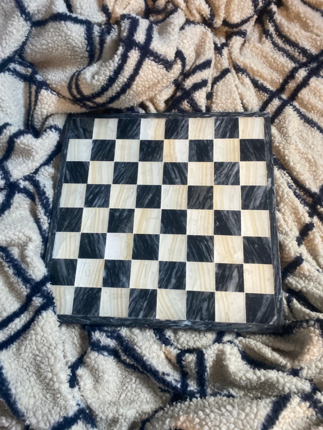 A beautiful chess board. Black and white checkered squares. The border is a dark grey stone. Features a burnt orange backing with felt feet, perfect for a moment of quiet thought.