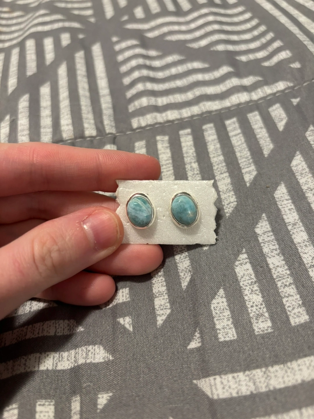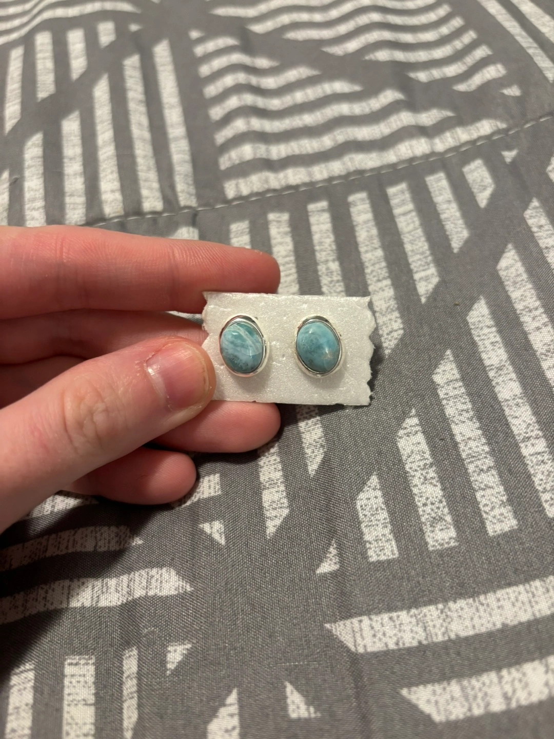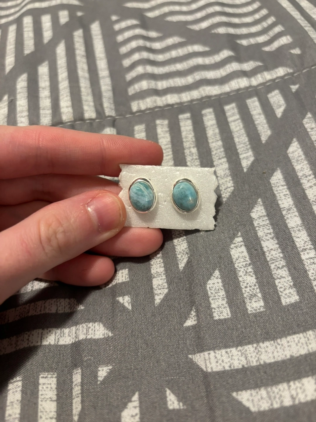 A pair of round stud earrings. The stones appear to be a light blue colour, with silver coloured metal. You will find these earrings lovely to wear as you relax.