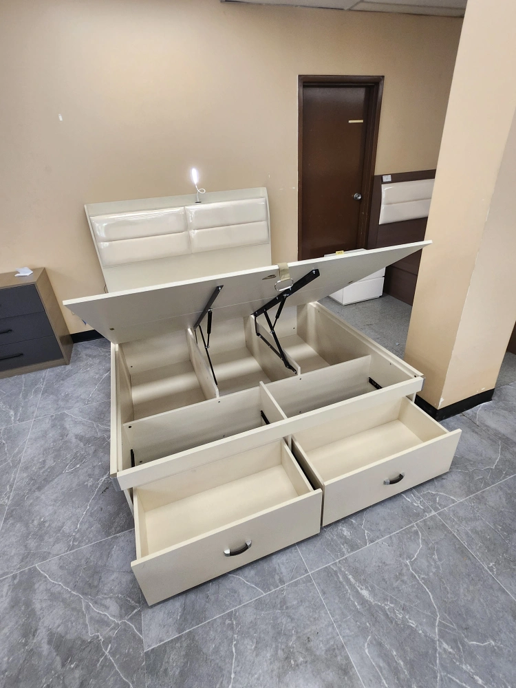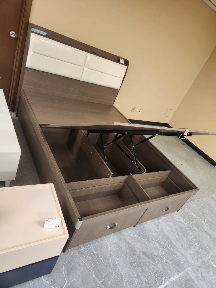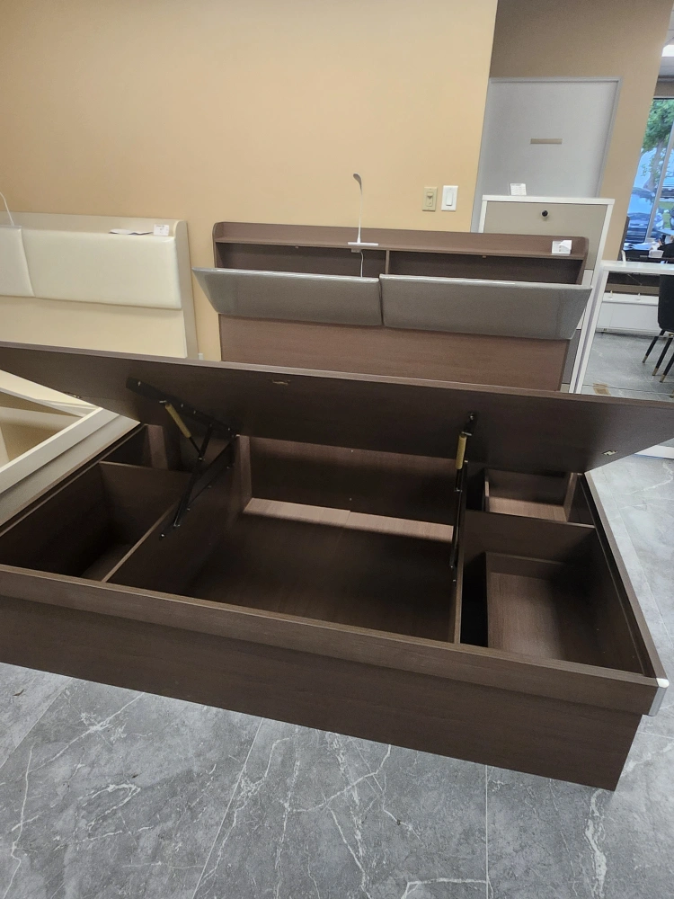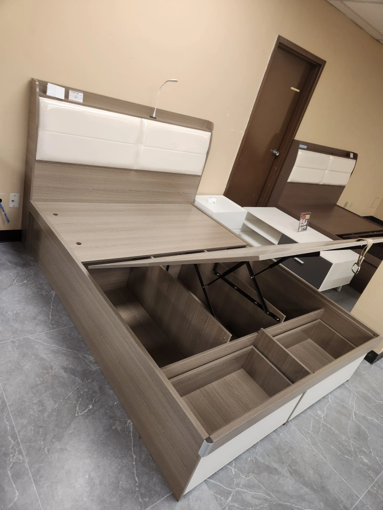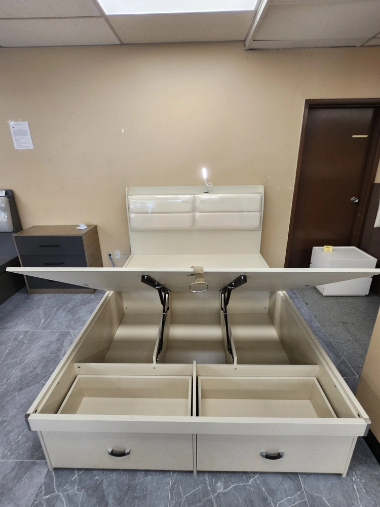 Selling a queen-size and king size bed frame with built-in storage. It's in great shape and offers a ton of extra space for your belongings. The bed features a lift-up mechanism to access the storage compartments underneath. Perfect for small apartments or anyone needing more storage solutions!