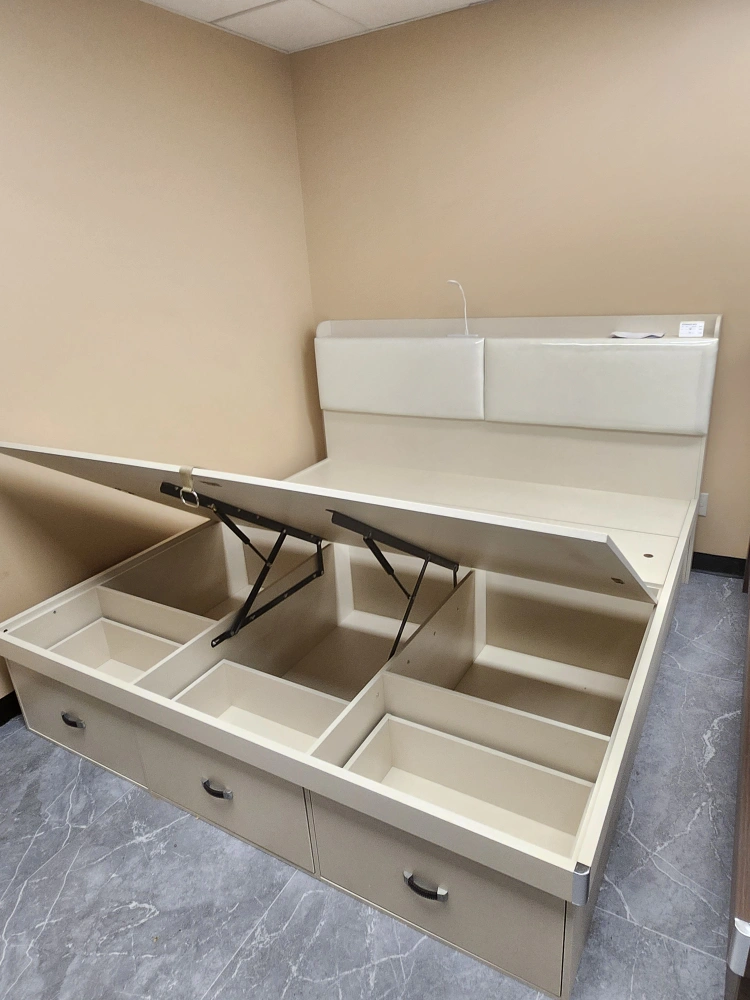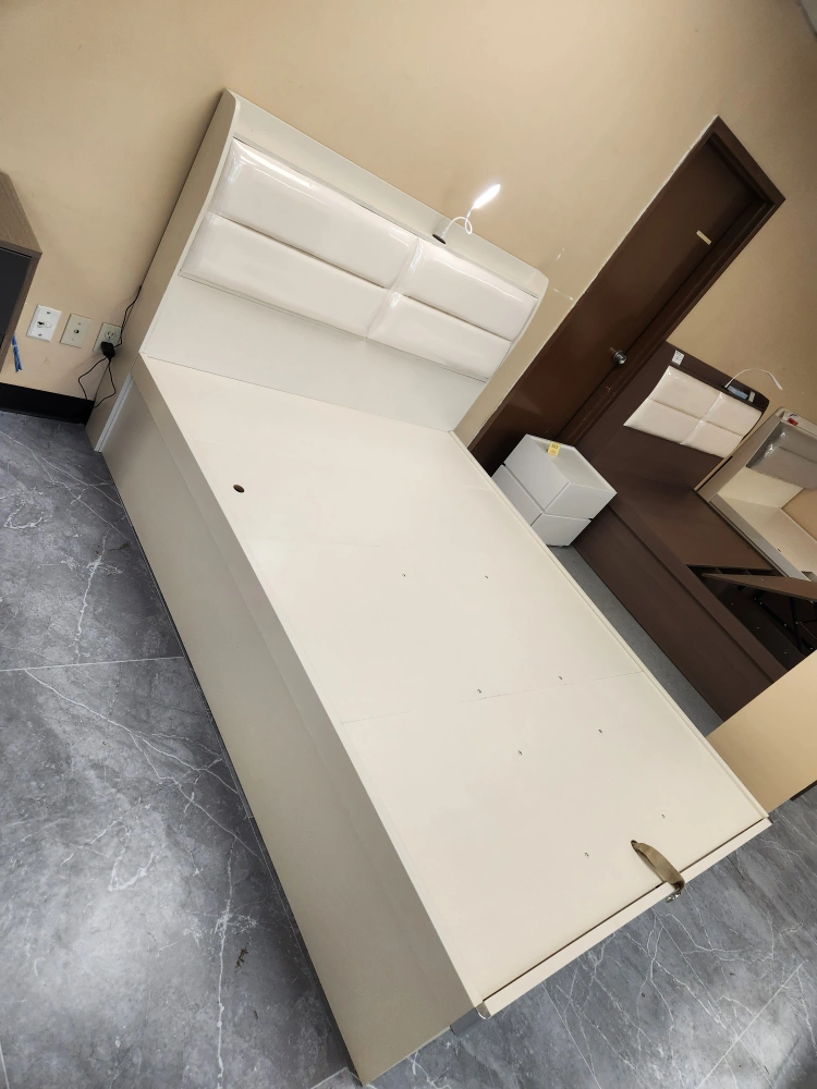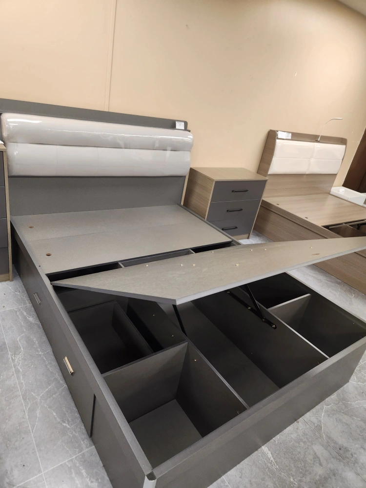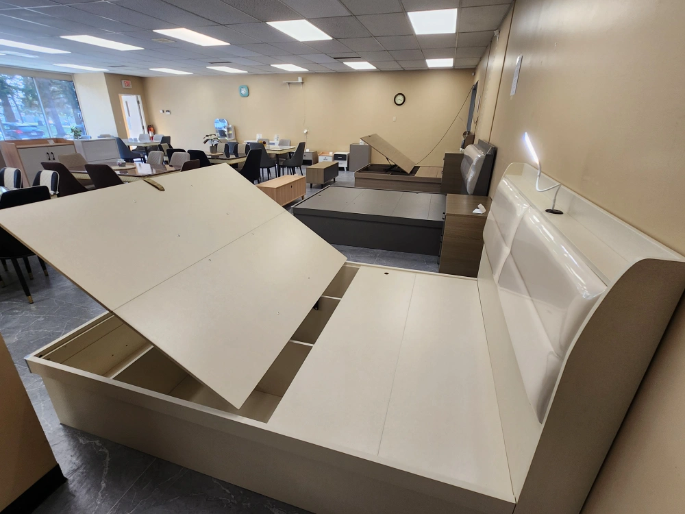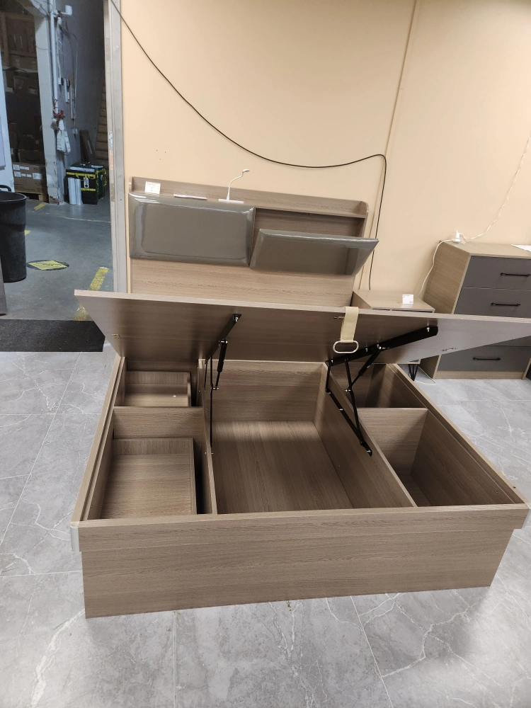 Selling a queen-size and king size bed frame with built-in storage. It's in great shape and offers a ton of extra space for your belongings. The bed features a lift-up mechanism to access the storage compartments underneath. Perfect for small apartments or anyone needing more storage solutions!