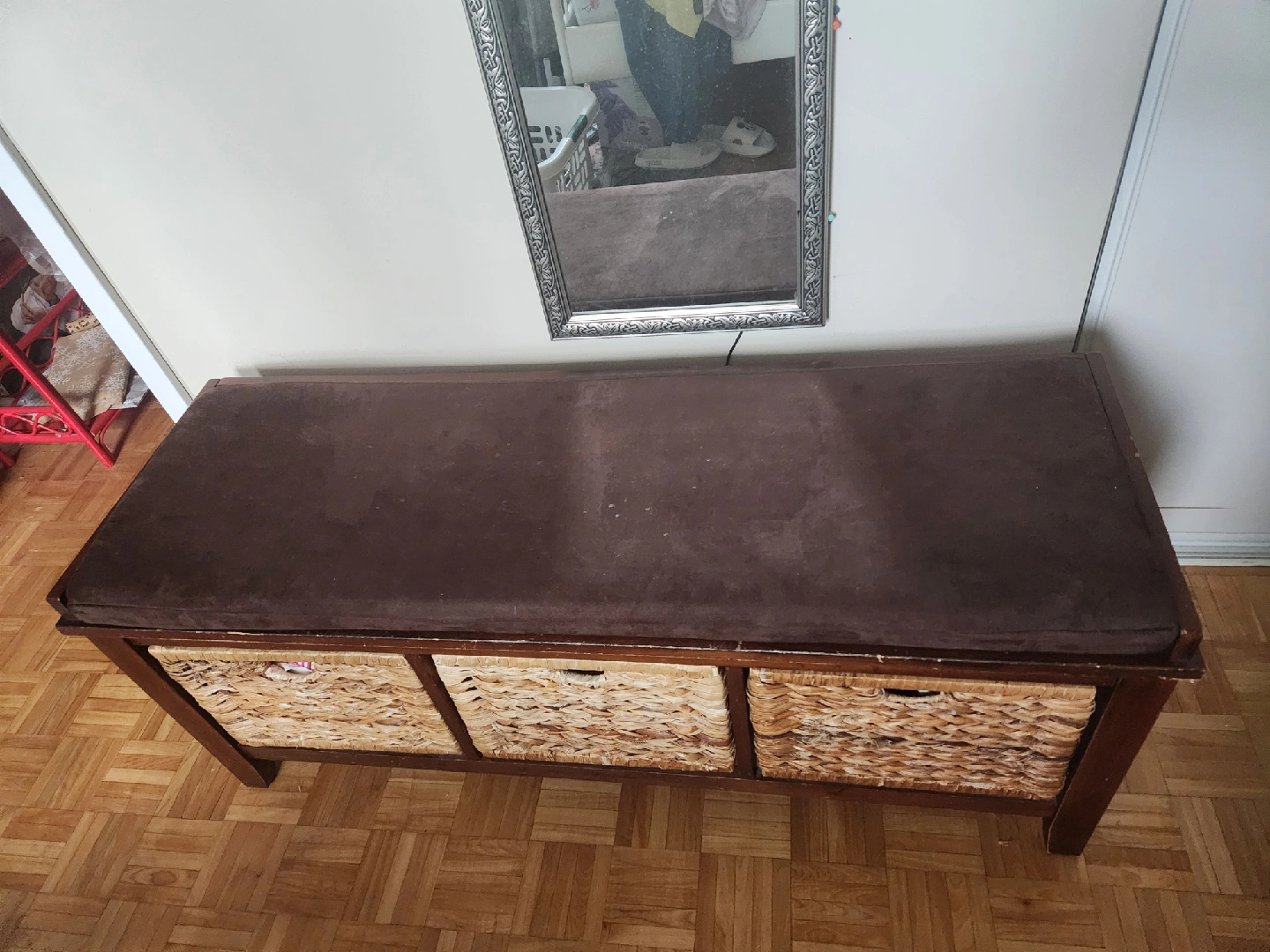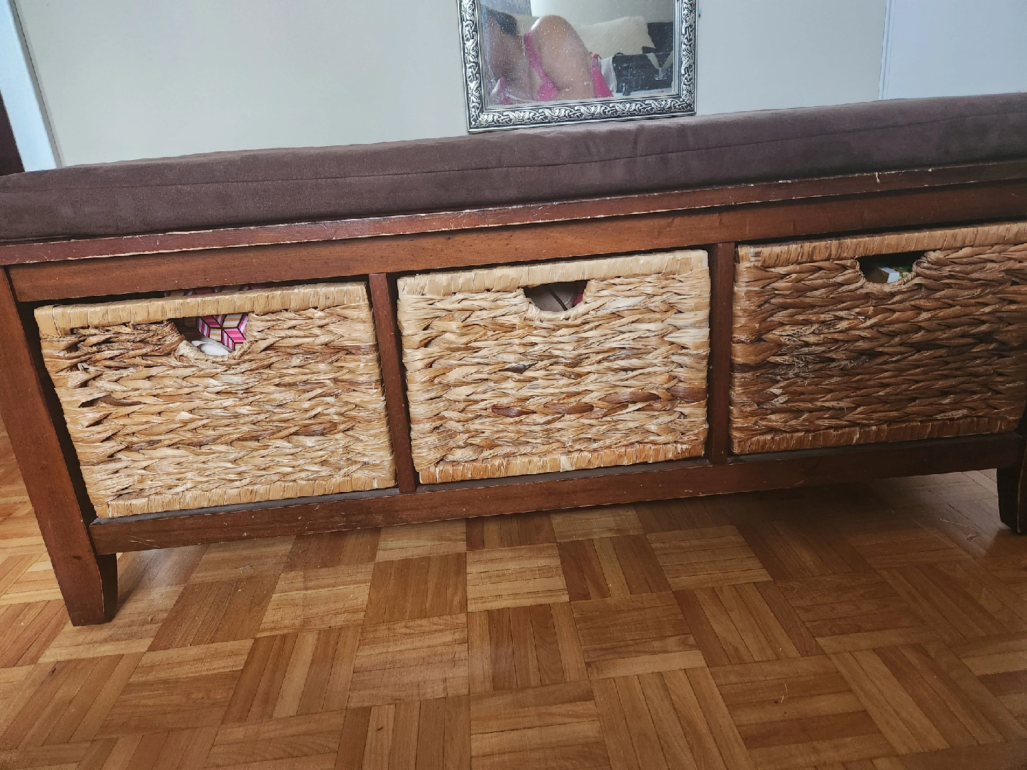 Storage bench with three wicker baskets. It's great for entryway or bedroom storage. The bench has a padded brown top for comfortable seating. The frame is a dark wood tone. Perfect for adding a bit of rustic charm and extra storage to your home