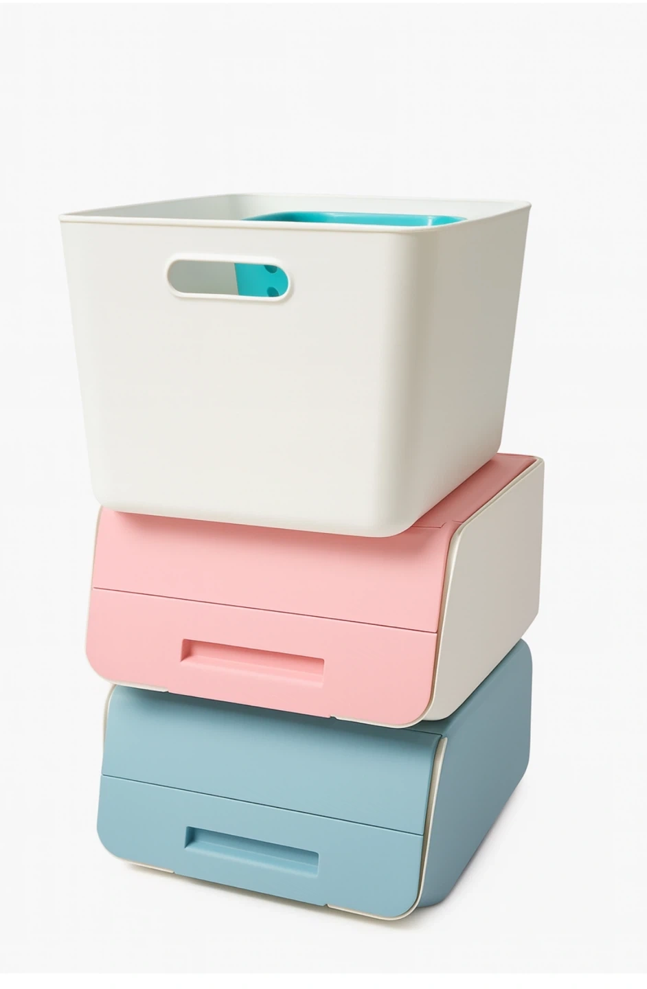 Selling a set of storage boxes! There's one white storage box, one pink storage box with a drawer, and one blue storage box with a drawer. Perfect for organizing your space!
