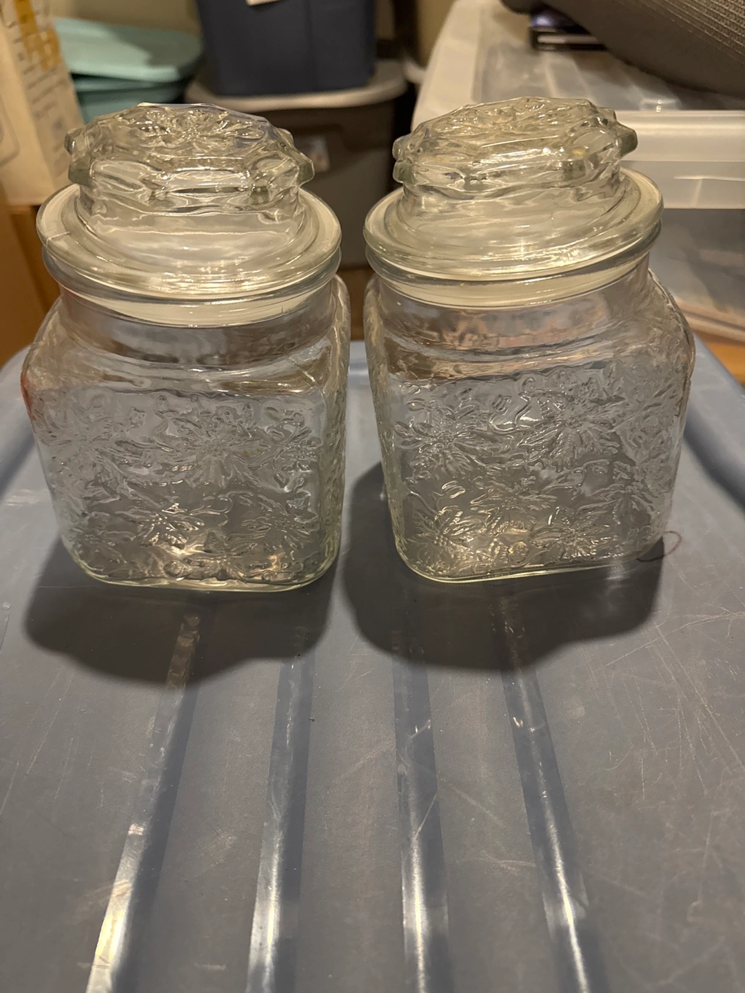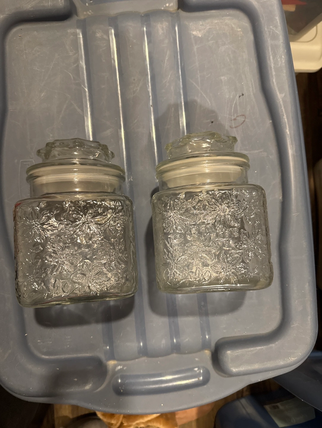 Set of two crystal storage jars with lids that seal. Square shaped with floral design. Great condition. Very pretty.