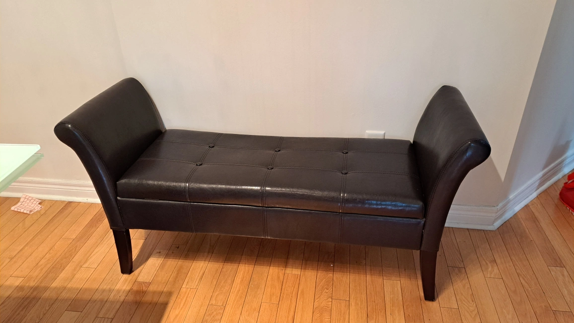 Black storage ottoman bench in great condition. It's perfect for adding extra seating and storage to any room. The top lifts up to reveal a spacious storage compartment, ideal for blankets, pillows, or other items. It's a stylish and functional piece of furniture that will complement any decor