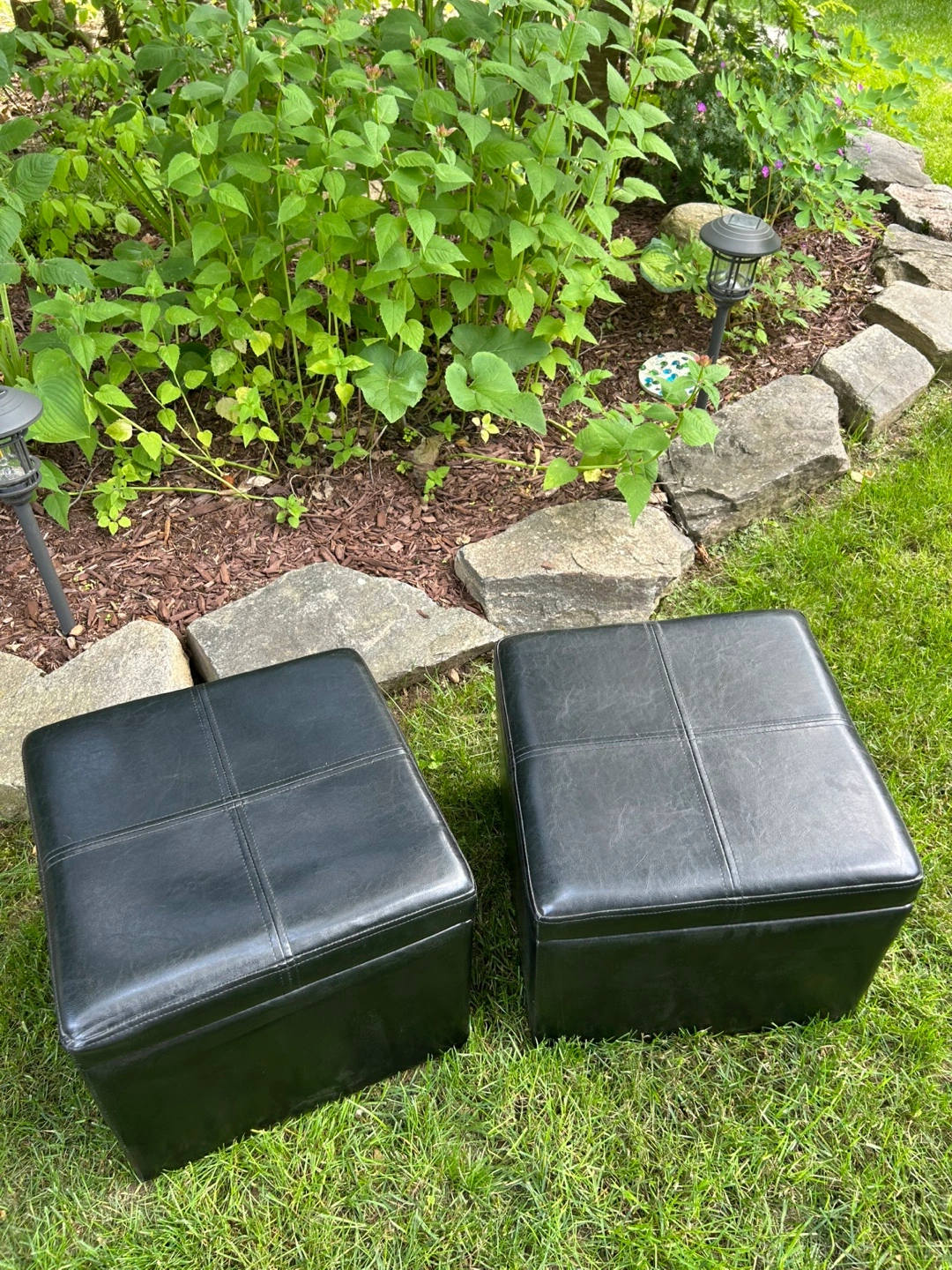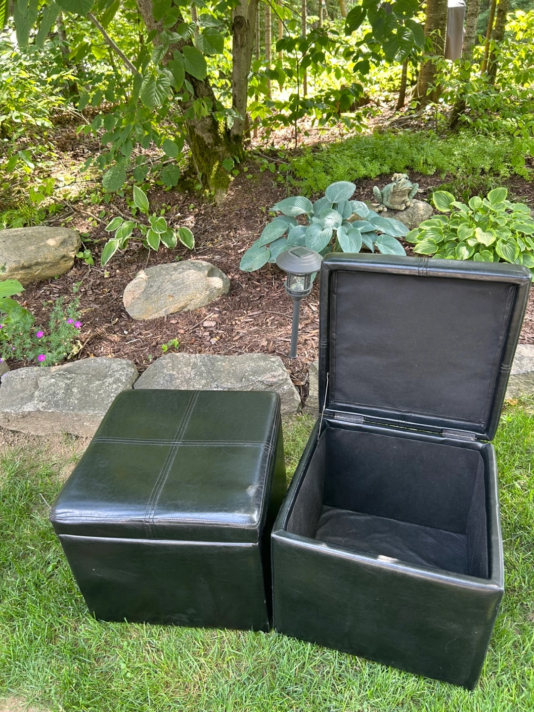 Two black storage ottomans for sale! They are in great condition and perfect for adding extra storage to any room. They can be used as a footrest or extra seating too! They are made of a faux leather material. Price is for both.