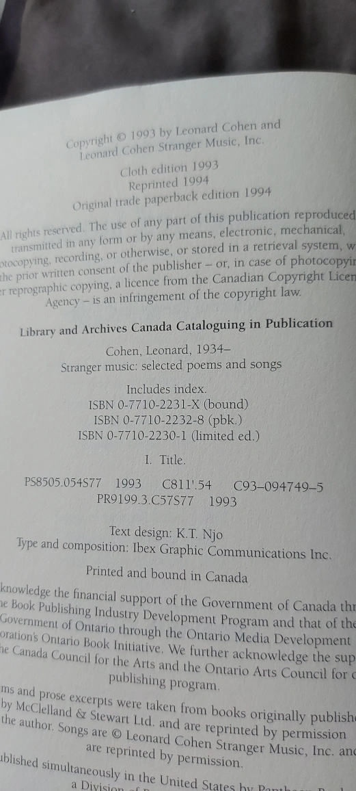 Selling a copy of Leonard Cohen's 'Stranger Music: Selected Poems and Songs'. It includes an index of his selected poems and songs. A great addition to any poetry collection!