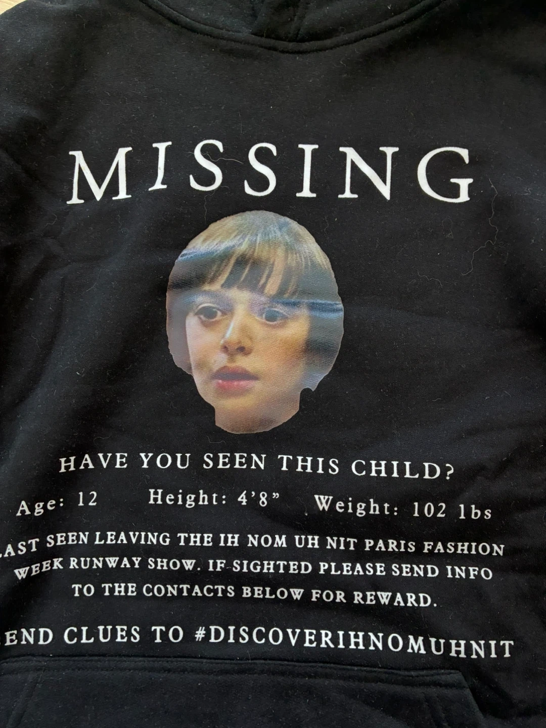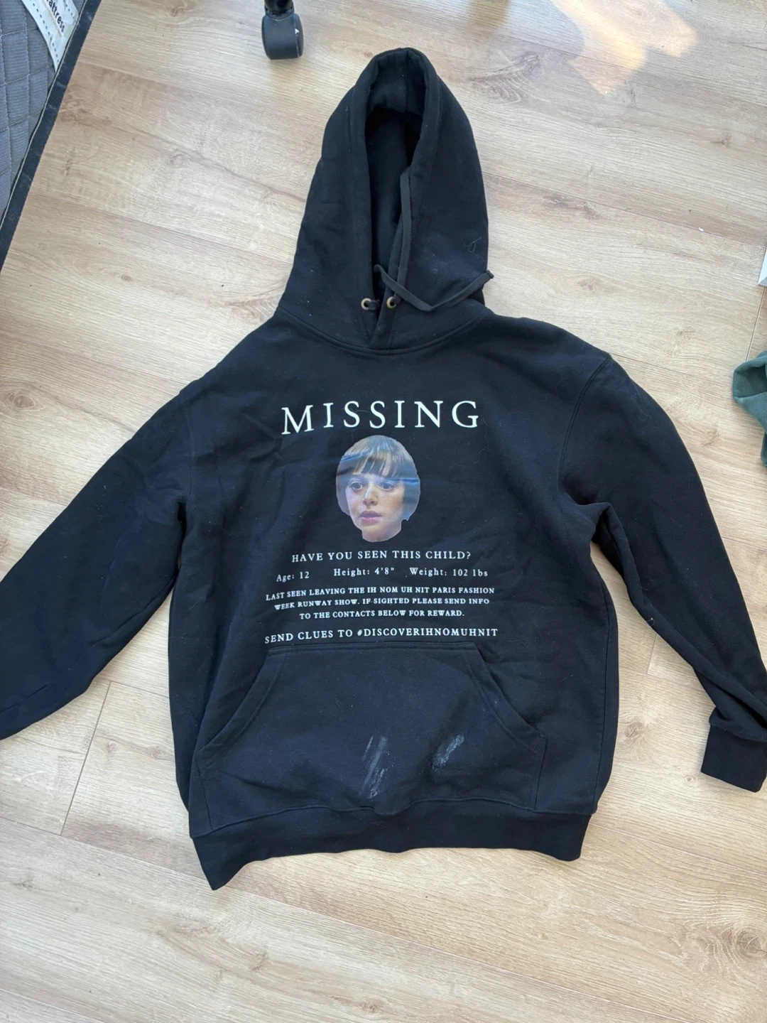 Selling a black Ih Nom Uh Nit Paris hoodie in size M. The hoodie features a unique design on the front and the brand name on the back. It's in good condition and ready for a new home!