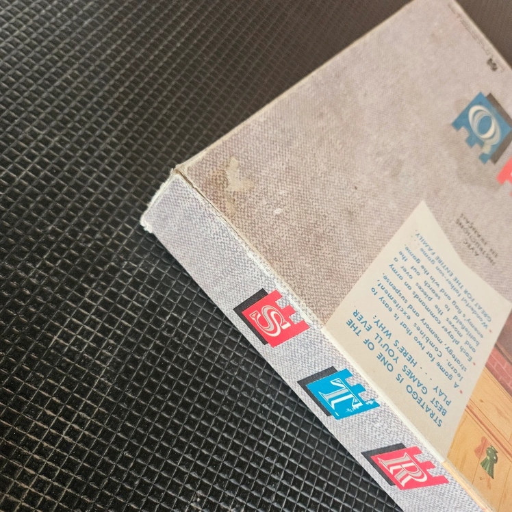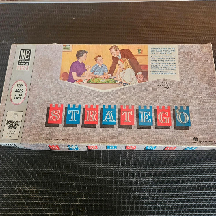 Original Stratego board game vintage 1961. This is 1961 Stratego Game by Milton Bradley Condition: Complete Game board has some damage at center crease on one end The box is in good condition, some tears see photos for all flaws Reasonable wear for age, stain on box cover See pictures as they are partnofnthe description Description: The gameboard is your battlefield. You have an army of men at your disposal and six bombs. Your mission--protect your flag and capture your opponent's flag. Secretly place your men, bombs, and flag on the gameboard with these objectives in mind. But remember your opponent is doing the same thing, so you must plan a defense as well as an offense. Once the armies are in place, advance your men. When you're one space away from an enemy, attack. You and your opponent declare ranks. The lower-ranking man is captured and out of play. You control your pieces and risk your men in battles where the strength of your enemy is unknown. The suspense builds as your men move deeper into enemy territory. Move with caution and courage. The next piece you attack could be a bomb. And when attacked, it could "blast" your man off the board and out of play. The first to capture an enemy flag is the winner! 2 Players 45 Min Playing Time Age: 8+