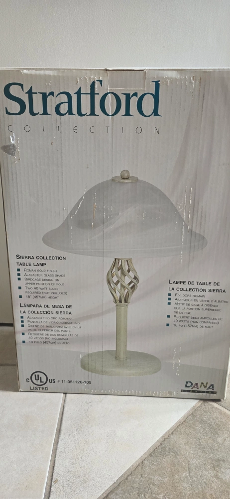 BRAND NEW Selling a Stratford Sierra Collection table lamp. It has a Roman gold finish and an alabaster glass shade. It also features a birdcage design on the upper portion of the pole. It requires two 40-watt bulbs (not included). The height is 18" (457mm).