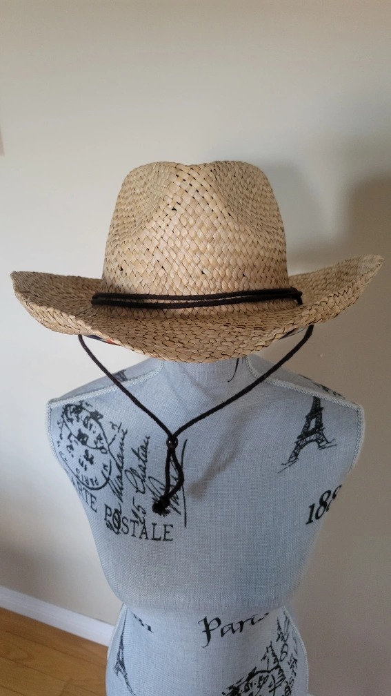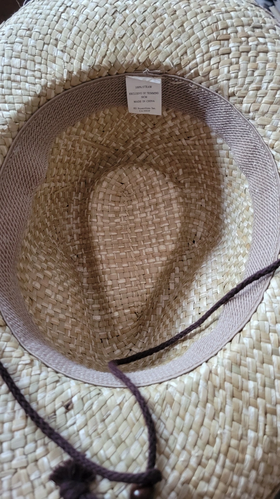 Selling a straw hat. It's made of 100% straw, perfect for keeping the sun off your face. It's a great accessory for summer outings or a casual day out